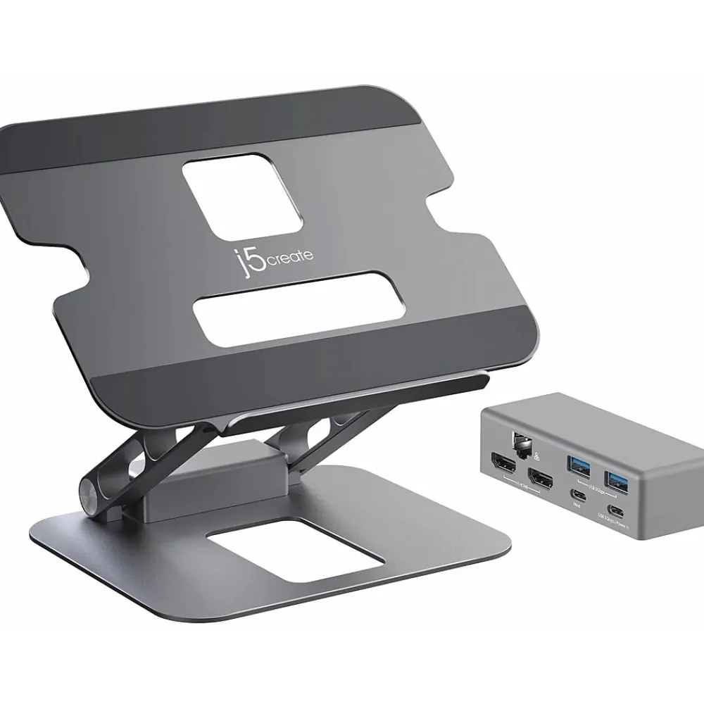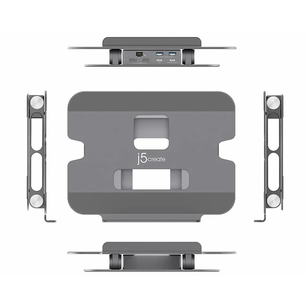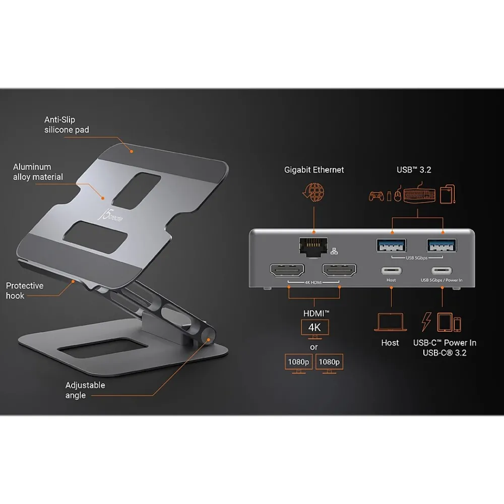 Made of durable aluminum, this j5create multi-angle stand can support a variety of items in addition to a laptop, including tablets, books, etc. The foldable design allows for easy storage or transport, while the viewing angles and heights can be adjusted to fit your needs and optimize your viewing experience. This versatile stand gives you the ability to create a more efficient workspace, whether you need extra space or a standing desk setup. The integrated USB Type-C mini dock lets you easily create a workstation with one 4K HDMI or dual 1080p HDMI display outputs, a Gigabit Ethernet port for easy network access, and two 5Gbps USB Type-A downstream ports, as well as a USB Type-C port that supports 5Gbps data transfer rate and up to 100W pass-through, providing all the connectivity you need for enhanced productivity and to connect your peripherals.