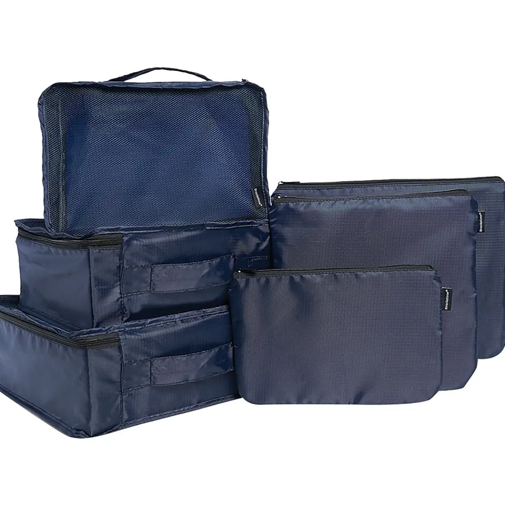 This Brookstone six-piece travel set is a handy and lightweight organization solution to overstuffed travel bags. Includes three pouches (small, medium, large) and three cubes (small, medium, large). Keep your travel essentials organized and neat for easy access.
