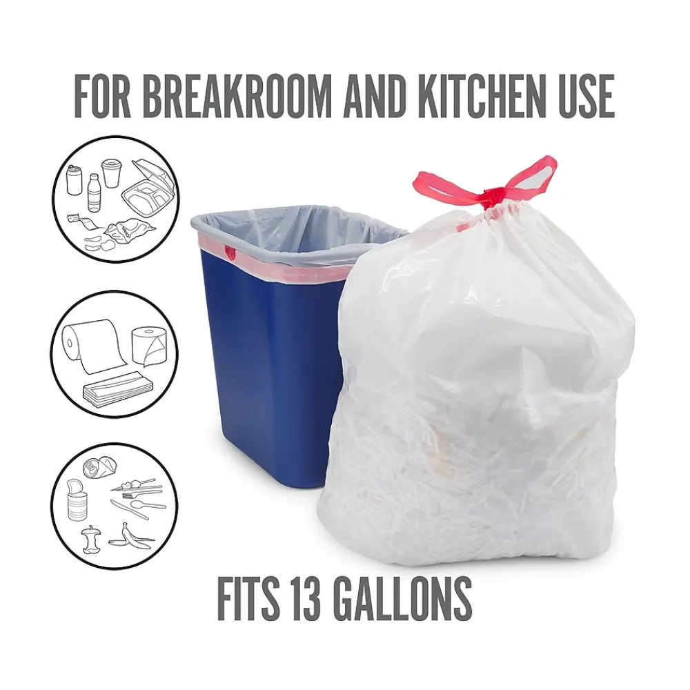 - 13 gal. regular-strength kitchen drawstring trash bags