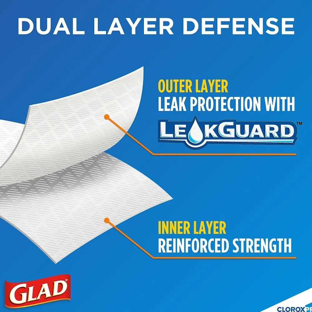 Keep your trash contained with the durability and quality of Glad CloroxPro. Glad Tall Kitchen Drawstring Trash bags are designed with ForceFlex technology to give extra flex as it expands around sharp edges and heavy loads, so you can pack it in without ripping. These dual-layered trash bags feature RipGuard and LeakGuard technology to resist punctures, rips and tears, and the seepage of liquids. Let the stretchable strength of Glad handle all the messes our busy daily life can throw at it and then some. The durable Grips-The-Can Drawstring ensures that the bag stays in place, and provides a sturdy 3-ply handle making it easy to lift, carry, and toss the bag. Tough and resilient, Glad can handle some abuse, so shake the trash deeper into the bag while keeping everything contained. The 13 gallon size is perfect for the kitchen or throughout the office and is great for your seasonal cleaning needs like Spring Cleaning and Back to School. CloroxPro, where clean means everything. Packaging may vary.
