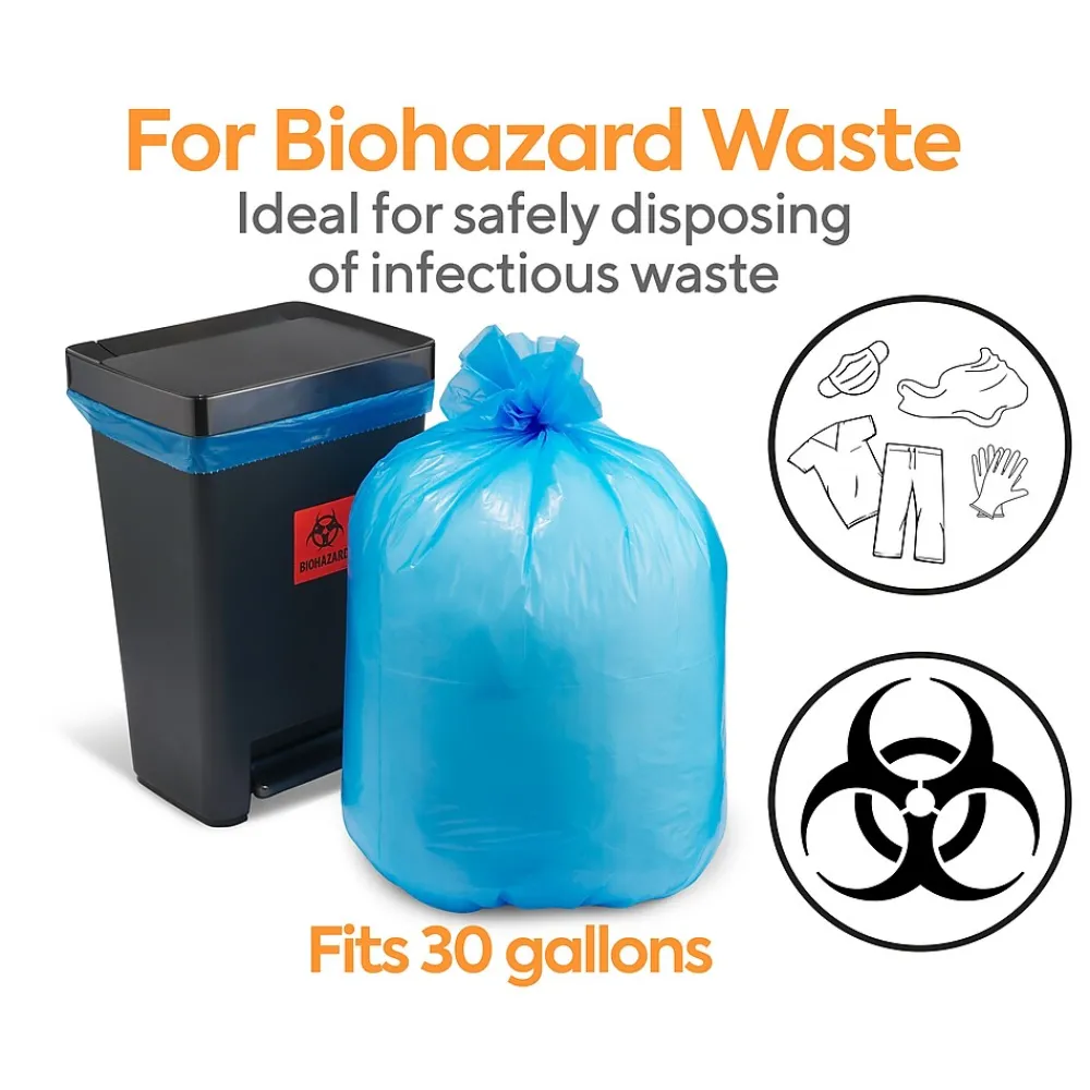 Keep medical facilities clean and sanitary with these 1.3-mil trash bags. The 20 to 30-gallon capacity lets you throw away plenty of waste before emptying, and the low-density plastic construction supports heavy and sharp items without stretching or tearing. These Coastwide Professional™ healthcare printed 20 to 30-gallon low-density trash bags are blue for easy visibility.