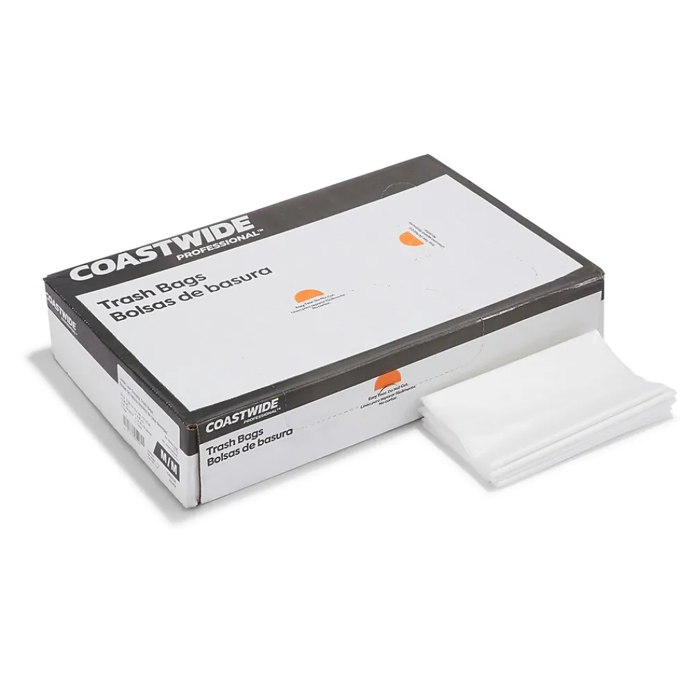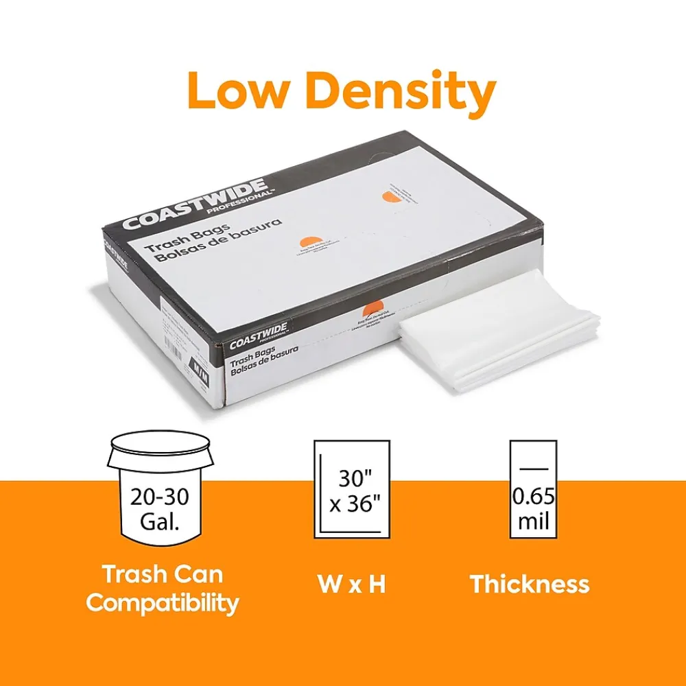 Toss out office and commercial garbage with these trash bags. The clear resin construction lets you see what you’re throwing away, and the low-density material resists tearing or stretching under the weight of heavy items. These Coastwide Professional™ 20 to 30-gallon low-density trash bags fit comfortably in medium-sized trash bins and easily handle most food and office waste.