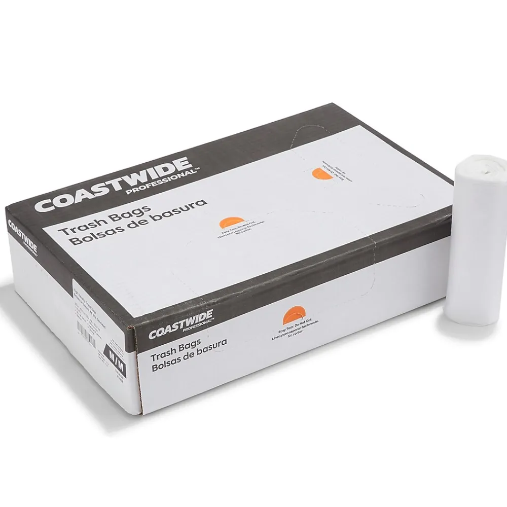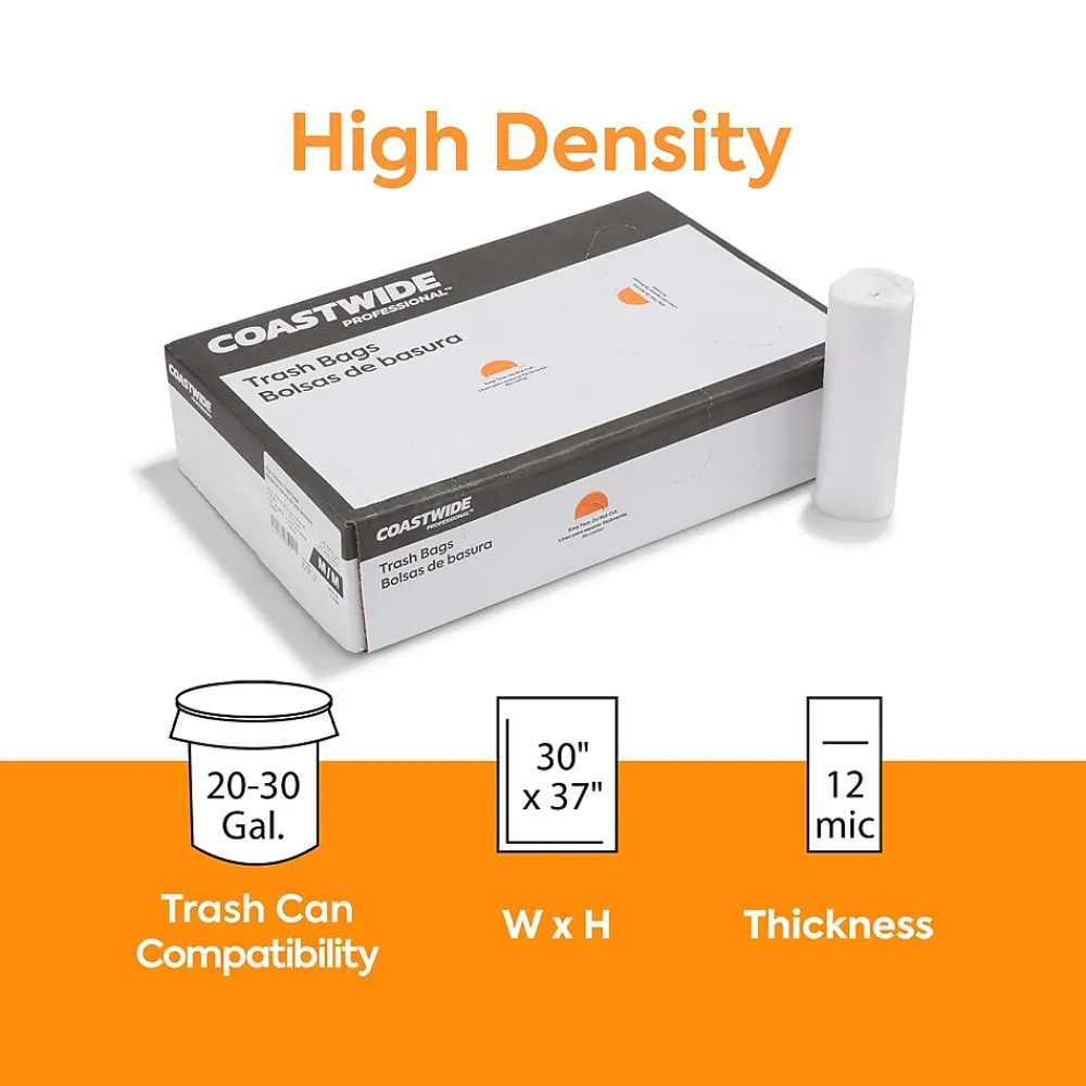 Stock the supply closet with these sturdy trash bags. A narrow carton facilitates vertical or horizontal storage, and coreless packaging allows one-at-a-time dispensing. High-density plastic construction contains paper objects, and the star-sealed bottom helps level trash, so bags slip out of the waste bin without rupturing. These Coastwide Professional 20 to 30-gallon trash bags feature a natural resin build for easy viewing before disposal, eliminating loss.