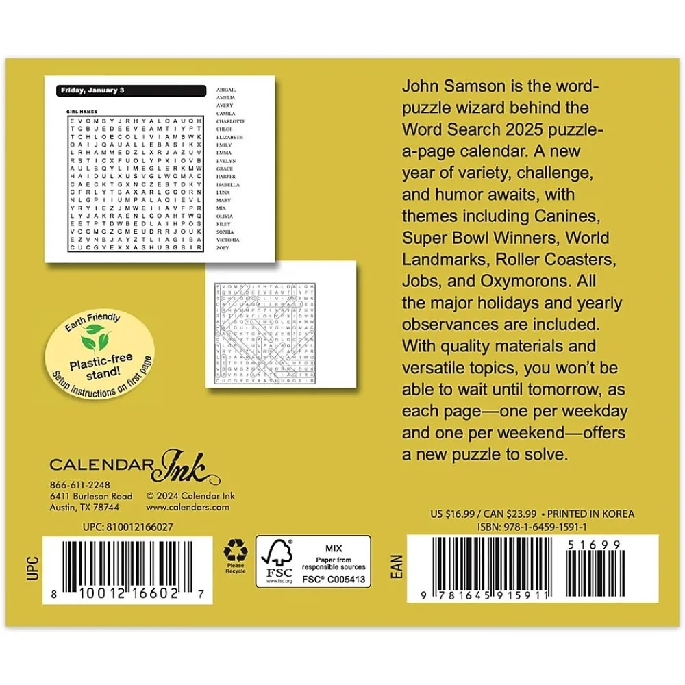 John Samson has done it again! He brings another year of variety, challenge, and humor to Word Search. This year’s calendar includes great themes. With quality materials, versatile topics, and fun and challenging themes, you won’t be able to wait until tomorrow!