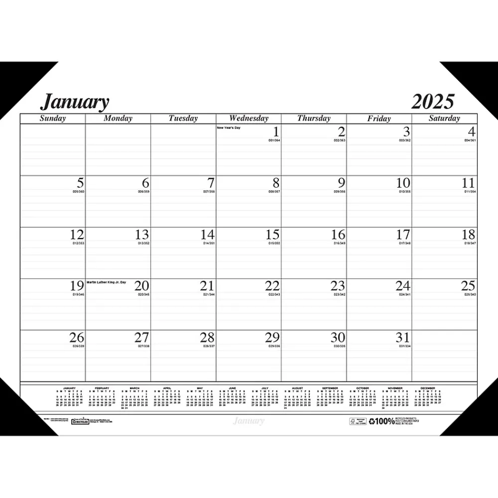 This House of Doolittle Economy compact monthly desk pad calendar comes with black reinforced leatherette corners, a full-year reference calendar on each page, Julian dates and days remaining, and lightly ruled daily blocks. Made in the USA, the calendar is printed with high-quality soy-based inks on FSC certified 100% postconsumer recycled paper. Perfect for smaller work surfaces.