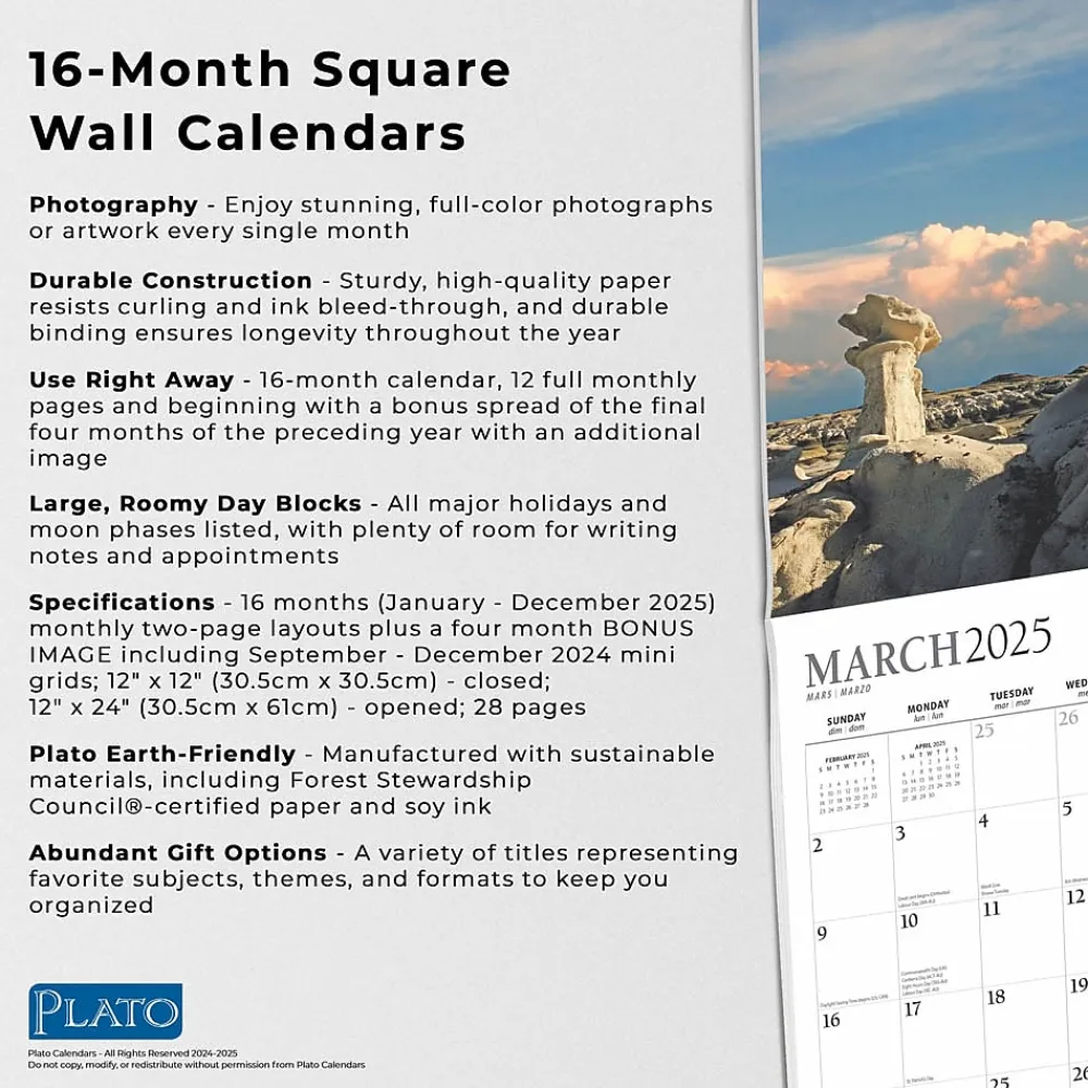 - Specifications – 16 months (two-page layout September–December 2024, and January–December 2025); 12″ x 12″ (closed); 12″ x 24″ (opened); 28 pages