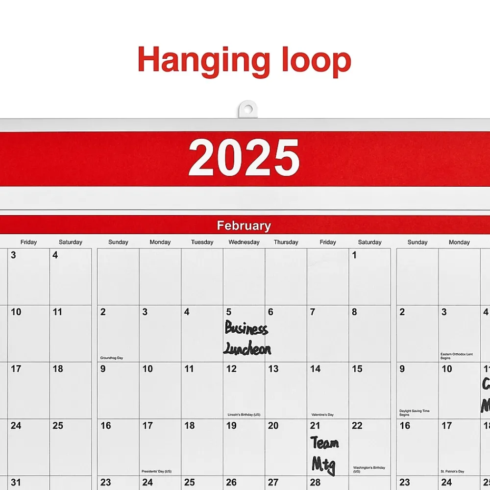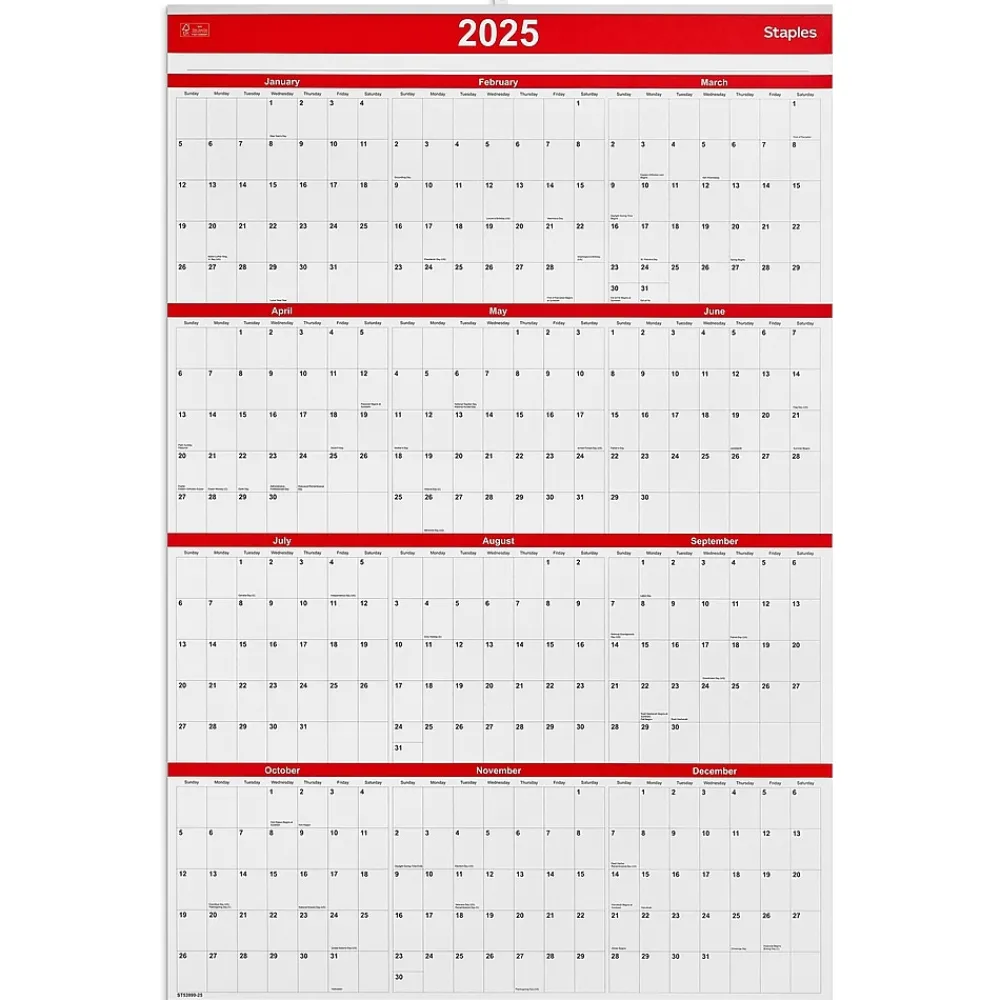 Coordinate your plans seamlessly with this 2025 vertical wall calendar. The paper material provides a smooth writing surface, while the large blocks offer ample space to create reminders. This Staples 24 x 36-inch 2025 vertical wall calendar features contrasting colors for easy visibility from a distance and a hook-and-loop closure for quick hanging.