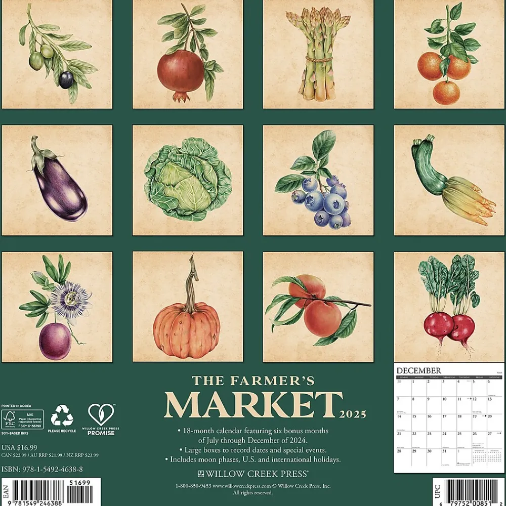From the crisp greens of spring to the rich harvest hues of autumn, the Farmers Market 12” x 12” Wall Calendar transports you to the heart of the season, capturing the essence of nature’s bounty in all its splendor. Hang it in your kitchen to inspire seasonal cooking, display it in your office to add a touch of natural beauty to your workspace, or gift it to a friend who shares your passion for all things fresh and flavorful.