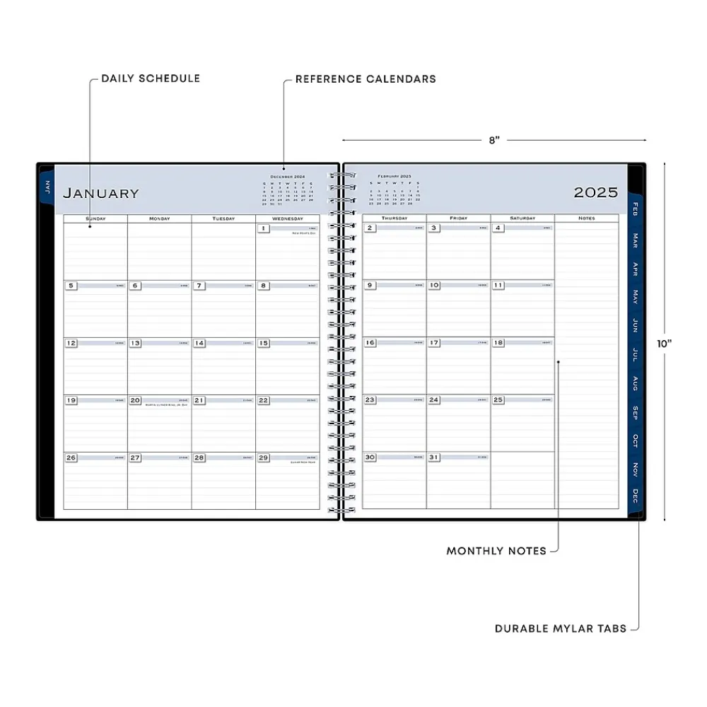 - Offers one month per two pages, with space for notes and quick reference calendars