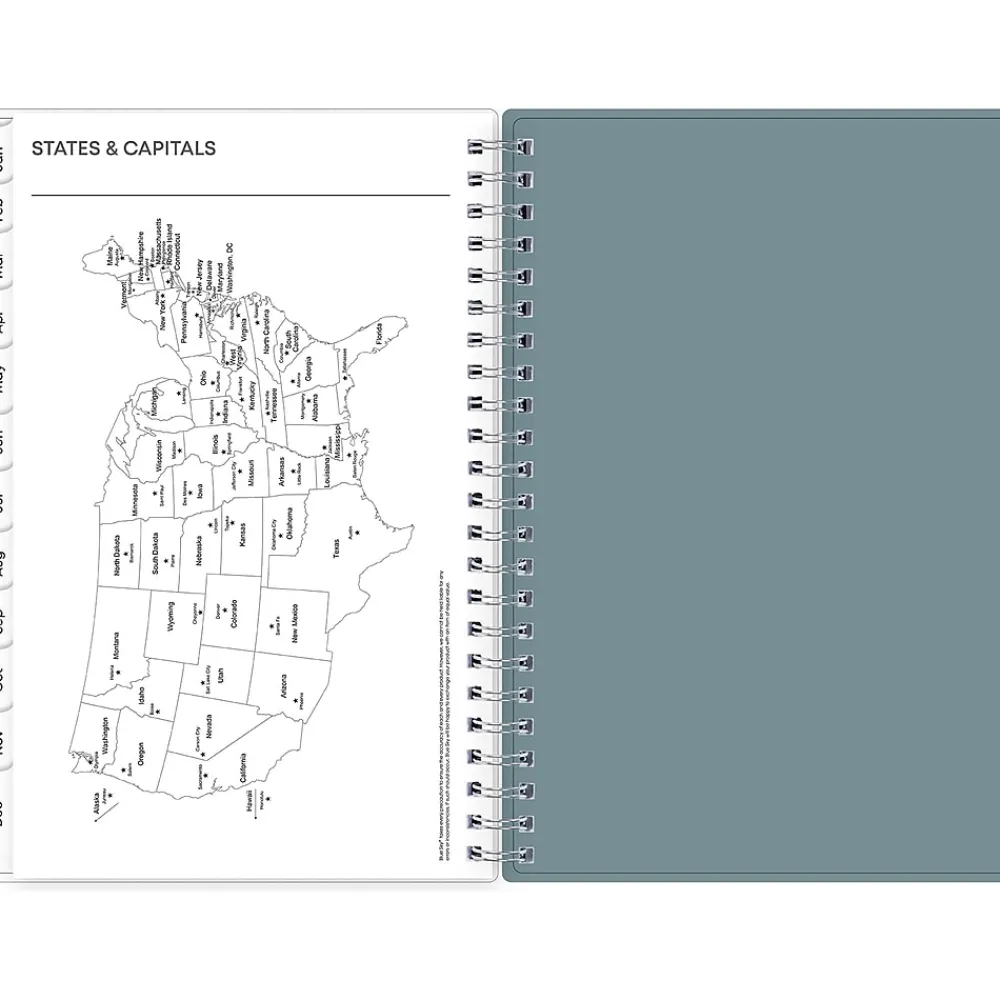 - Features one month per two pages and one week per two pages, with space for notes and quick reference calendars