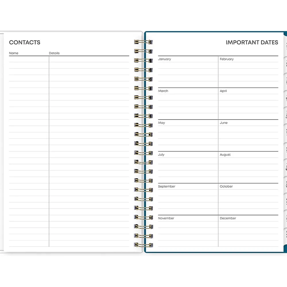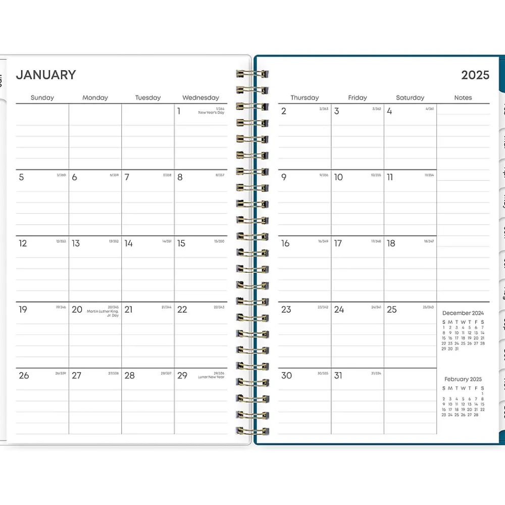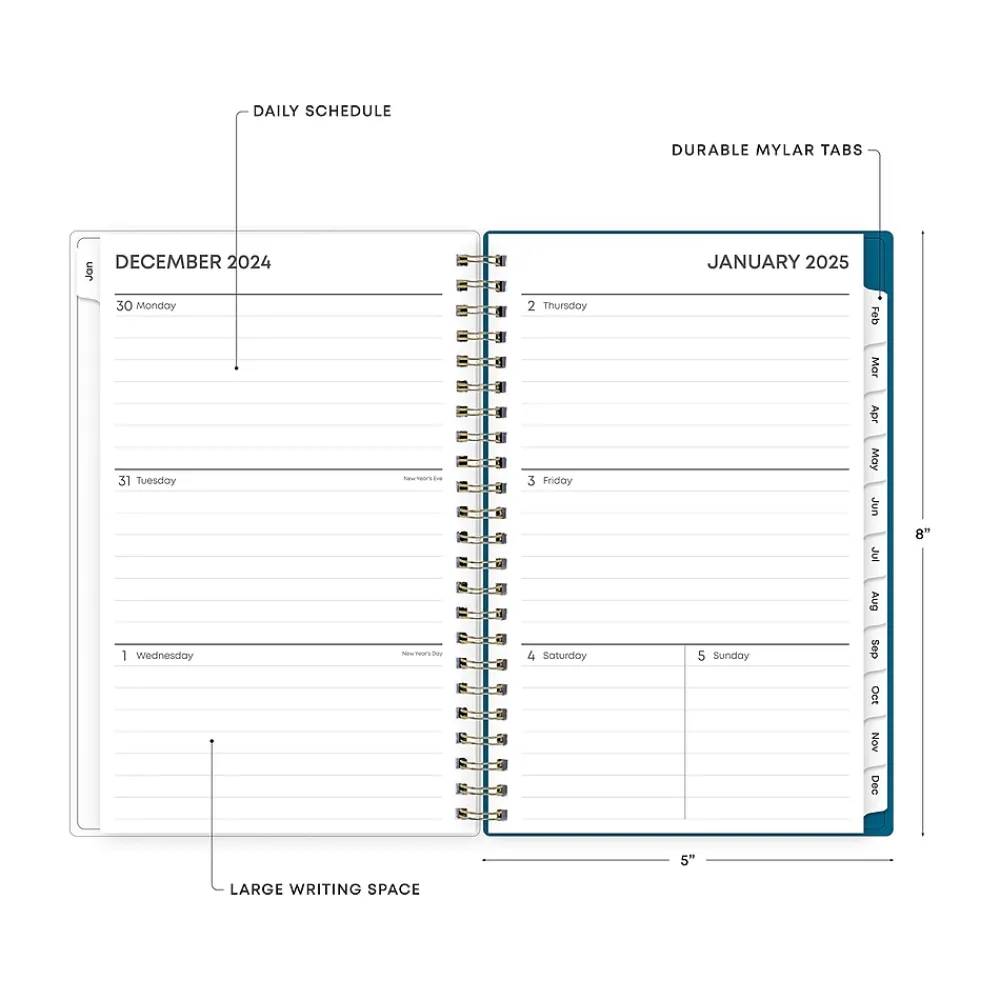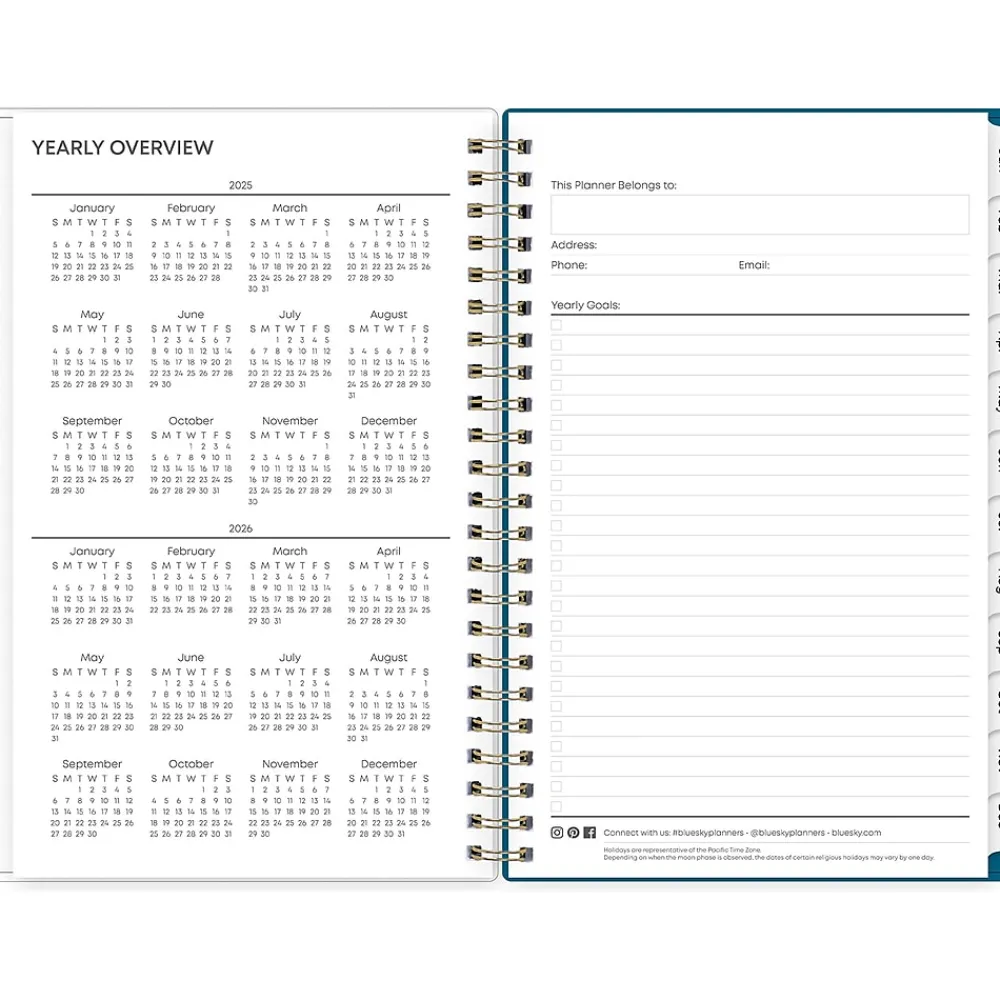 A simple planner for busy schedules. Organize tasks and time with the 2025 weekly and monthly Bakah Blue planner from Blue Sky. Use the weekly layouts, tabbed monthly views, and notes pages to effectively manage your schedule and achieve your goals.