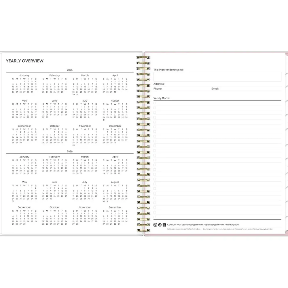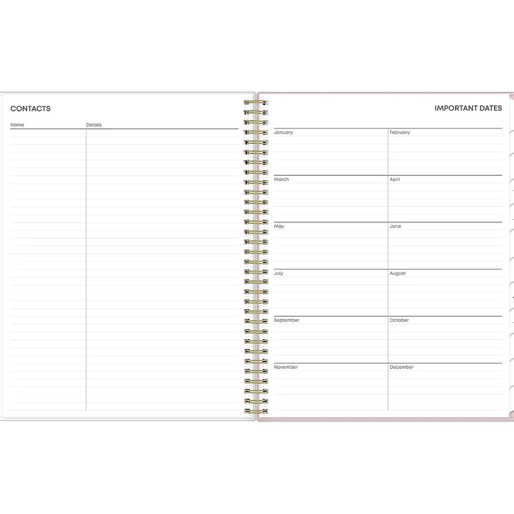 - Yearly overview, list of major holidays, and pages for your contacts, goals, important dates, and notes