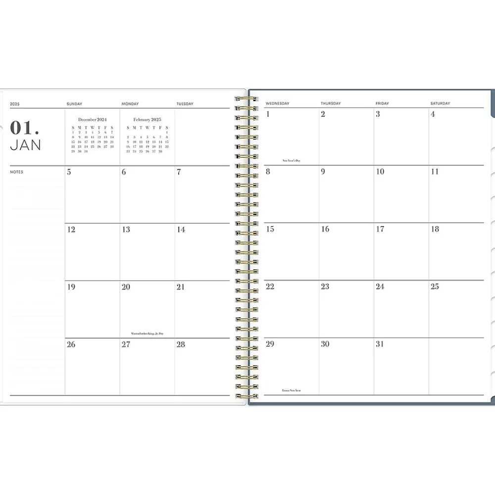 - Yearly overview, list of major holidays, and pages for your contacts, goals, important dates, and notes