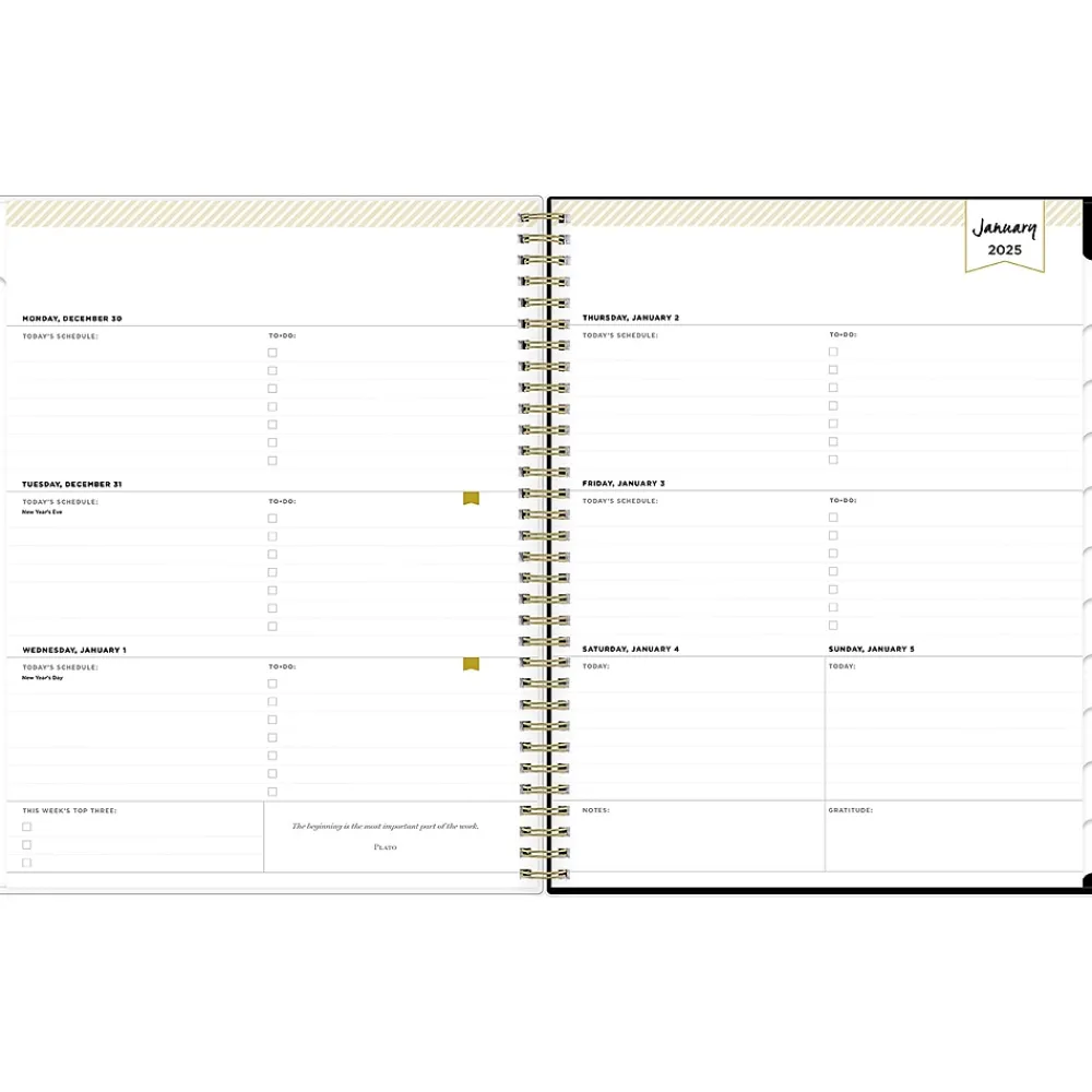 - Two-page weekly spreads with ruled daily blocks, daily checklists, an inspirational quote, and sections for top three priorities, notes, and gratitude