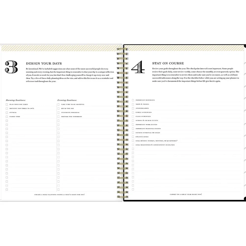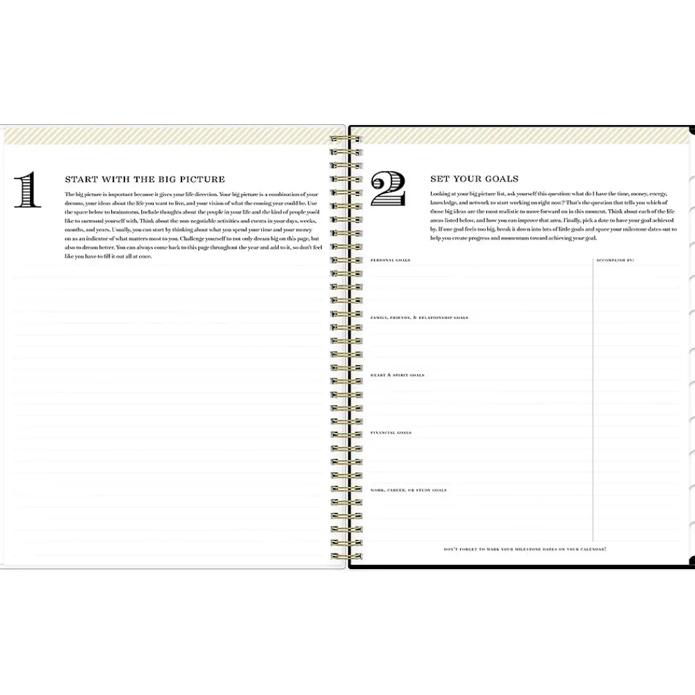 - Offers goal-setting worksheets, reference calendars, and pages for notes