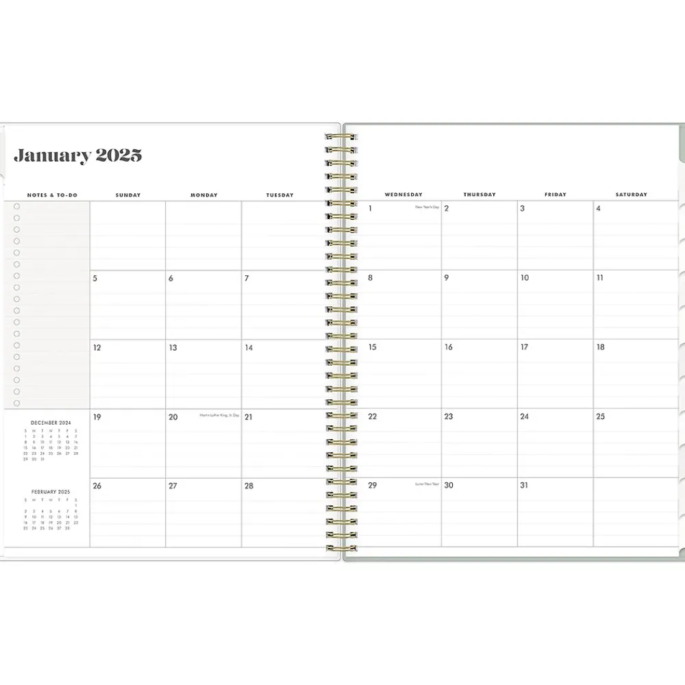 - Weekly and monthly planner covers 12 months from January 2025 to December 2025