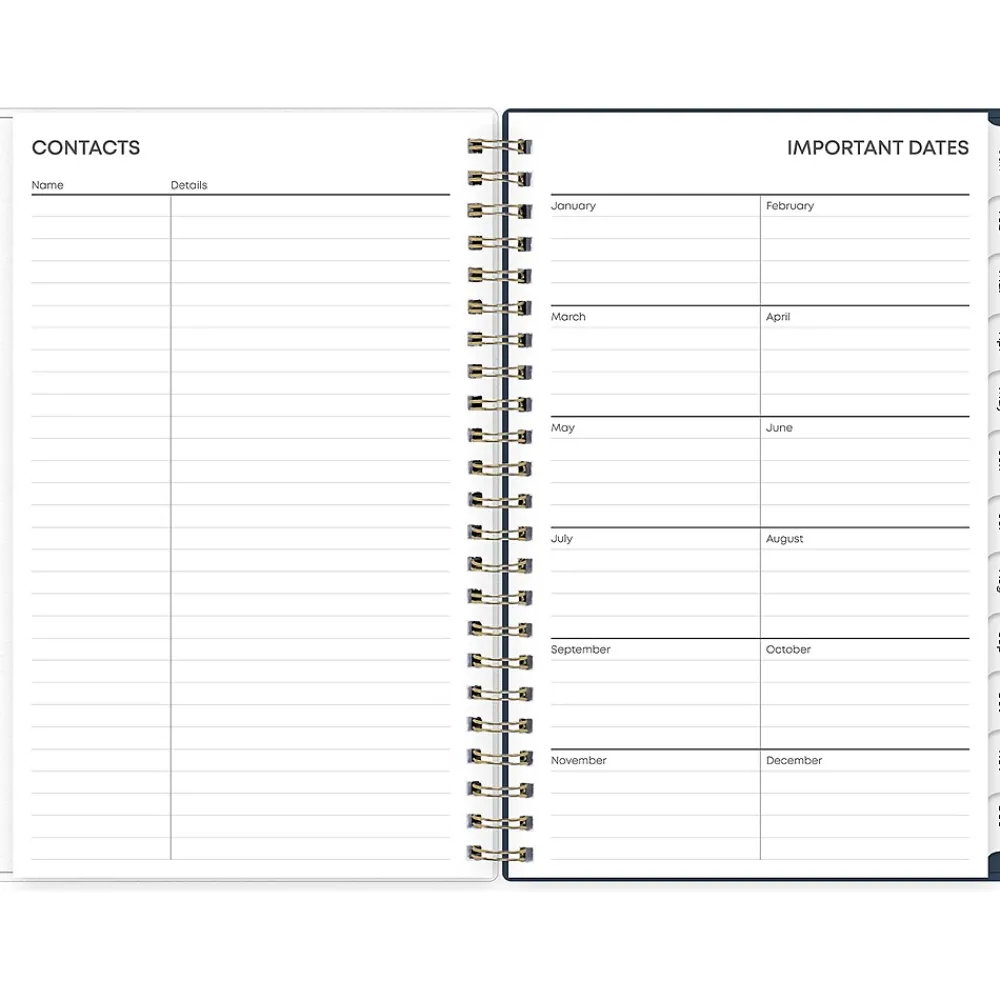 - Yearly overview, list of major holidays, and pages for your contacts, goals, important dates, and notes
