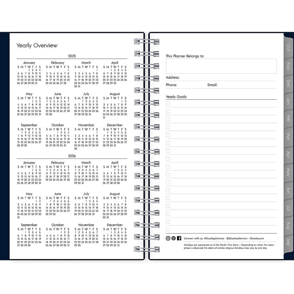 The 2025 Blue Sky Enterprise pocket planner has ruled weekly pages, tabbed monthly views, and notes pages. Use pages for your notes, goals, contacts, and important dates to stay organized.