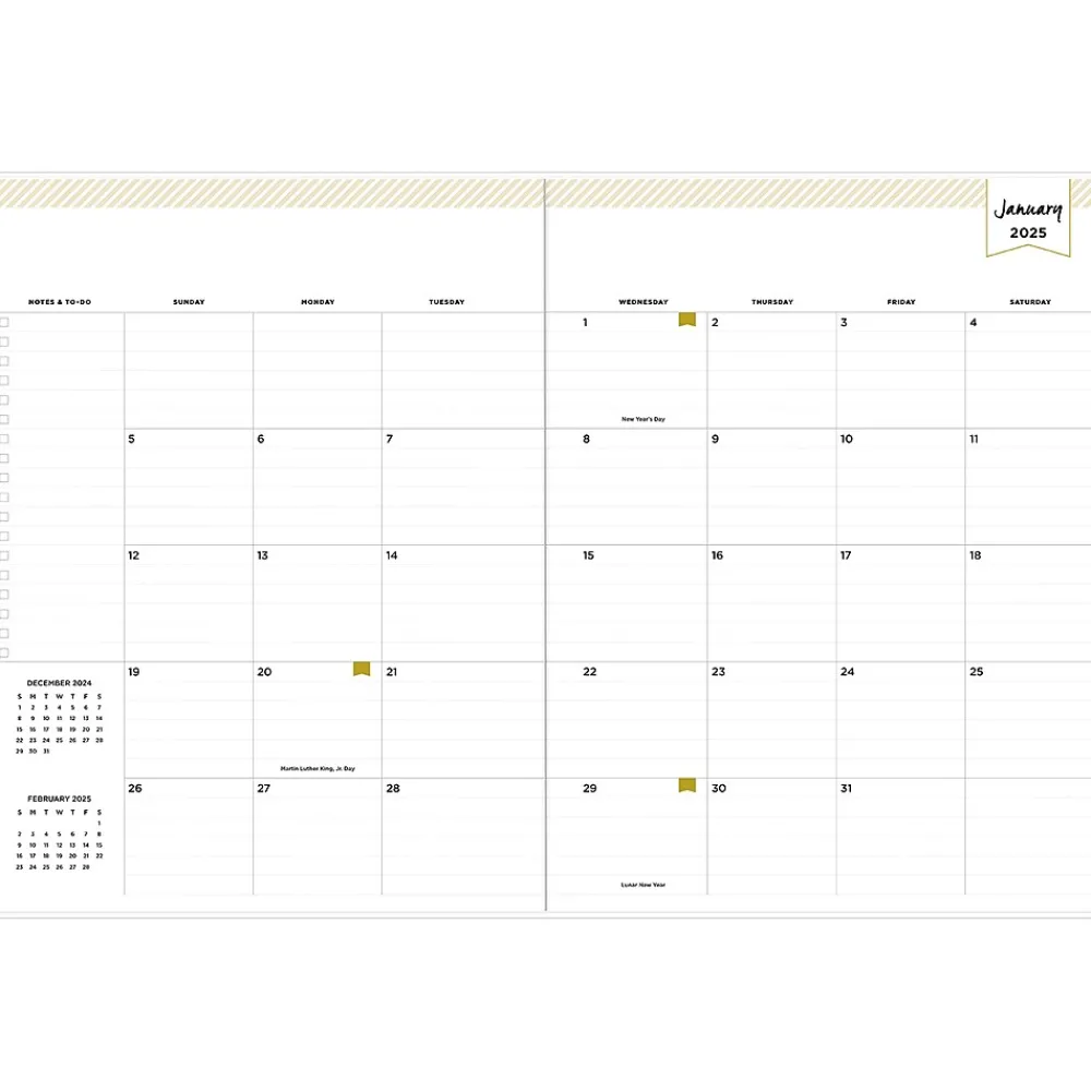 - Features two-page non-tabbed monthly spreads, with space for notes and quick reference calendars