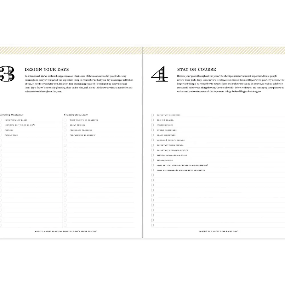 - Yearly overview, list of major holidays, and pages for your contacts, goals, important dates, and notes