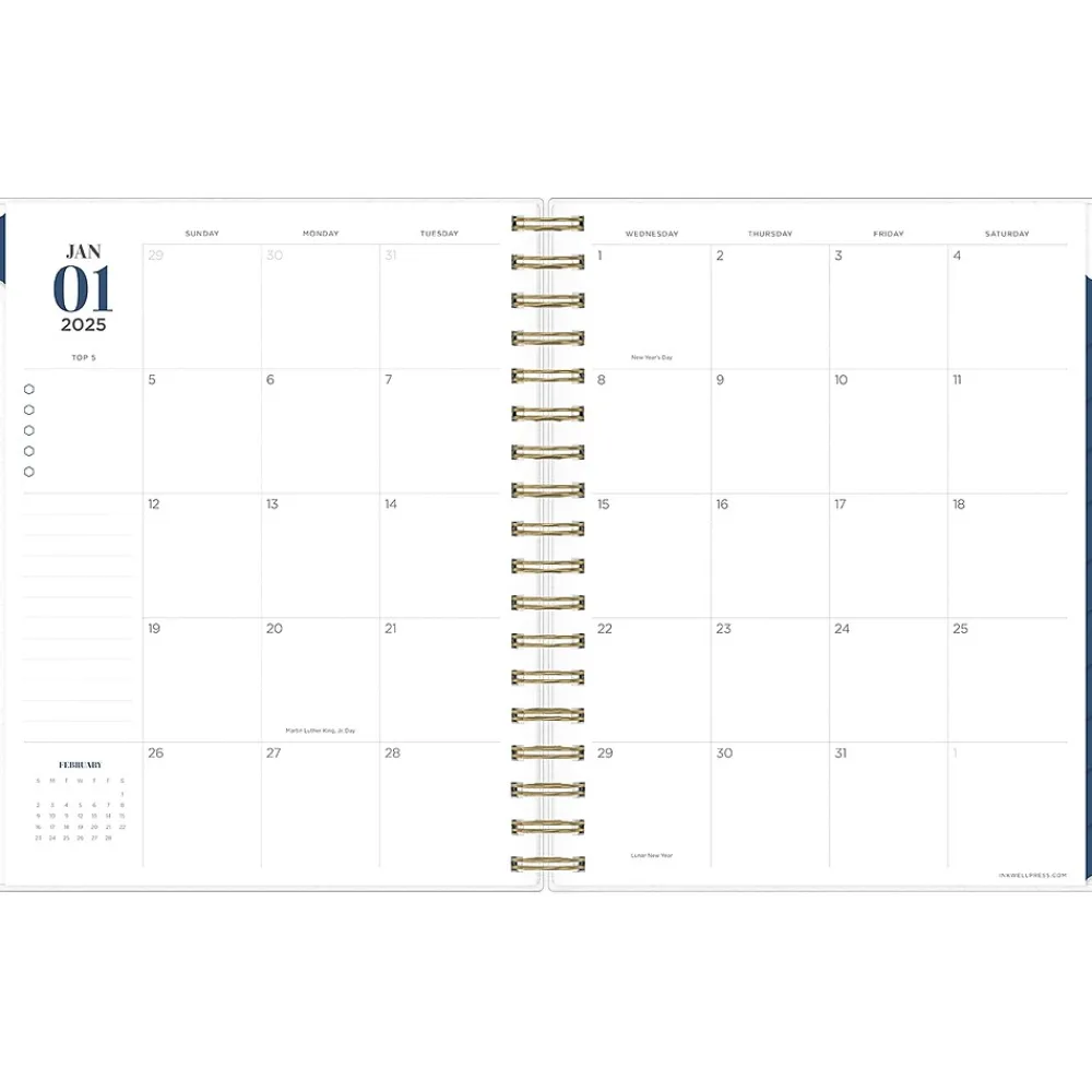 - One pay per day with hourly planning and sections for notes and priorities; two-page monthly views with space for notes, top five priorities, and next month reference calendar