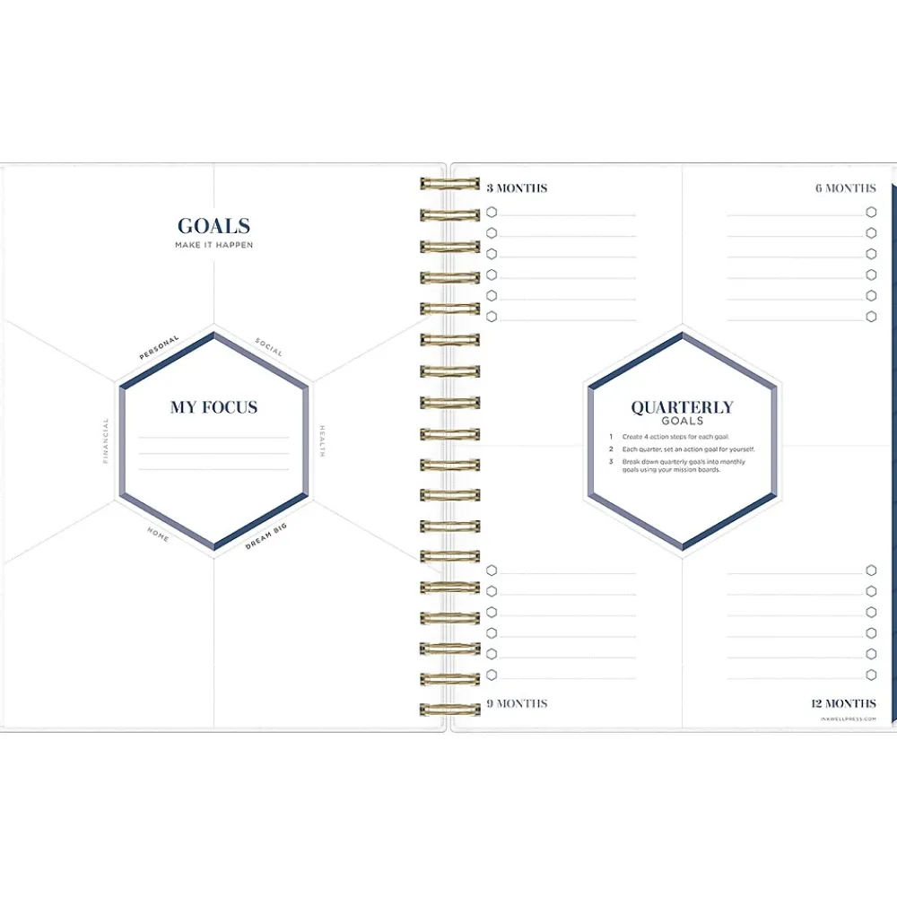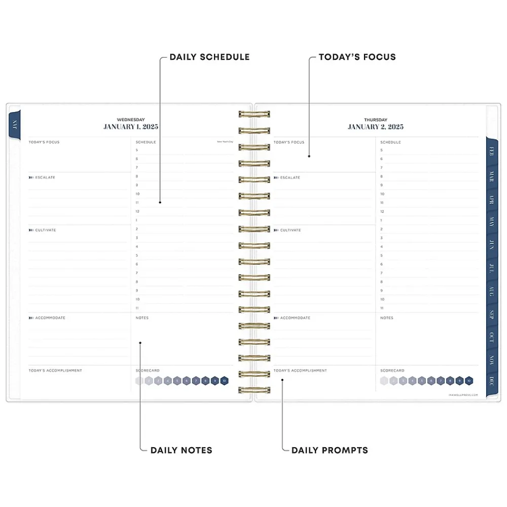 Achieve your goals with inkWELL Press for Blue Sky productivity planners, designed by time management expert Tanya Dalton. This Ombre Sky2025 planner includes the inkWELL Press flexible weekly layouts with tabbed monthly views and notes pages after every month. Use the goal-setting worksheets, monthly mission boards, and habit trackers to track your progress throughout the year. Includes stickers and a paper storage pocket.