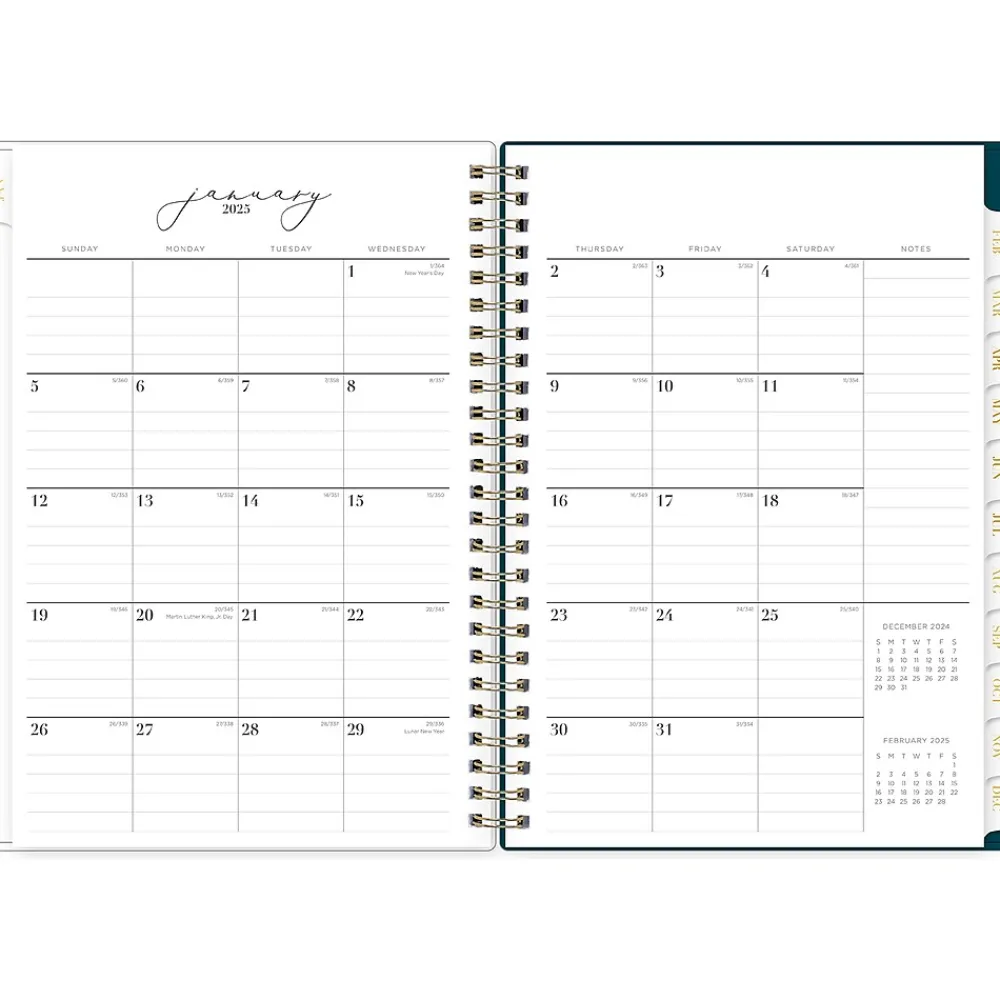 - Offers goal-focused weekly layouts with the week on the left page and sections for notes, goals, and to-dos on the right; and one month per two pages, with space for notes and quick reference calendars