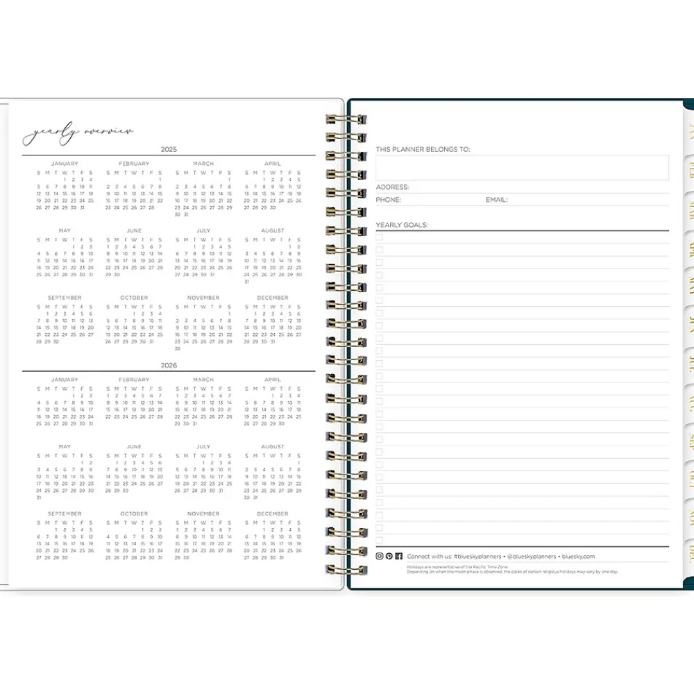 - Storage pocket, yearly overview, goals, contacts, and important dates
