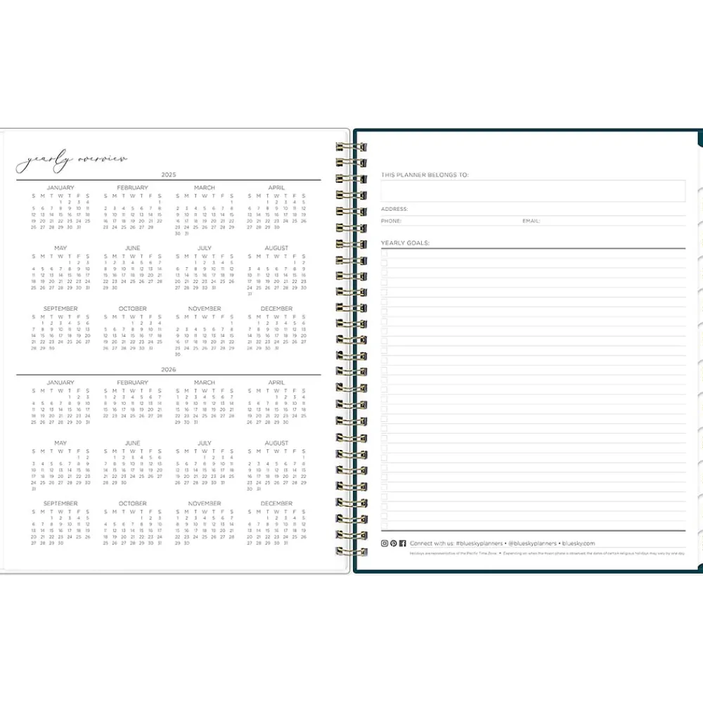 - Offers goal-focused weekly layouts with the week on the left page and sections for notes, goals, and to-dos on the right; and one month per two pages, with space for notes and quick reference calendars