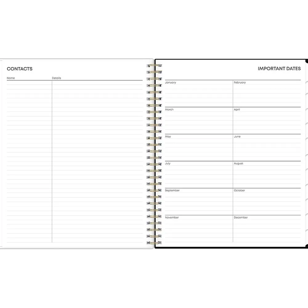 - Yearly overview, list of major holidays, and pages for your contacts, goals, important dates, and notes