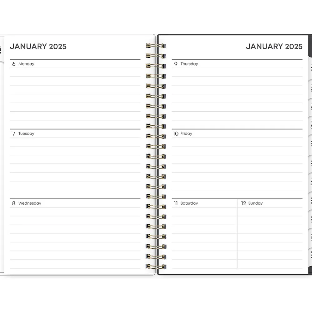 - Weekly and monthly planner covers 12 months from January 2025 to December 2025