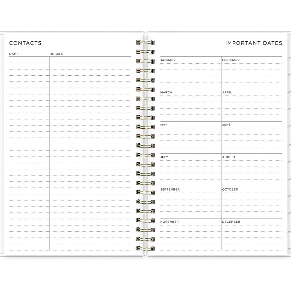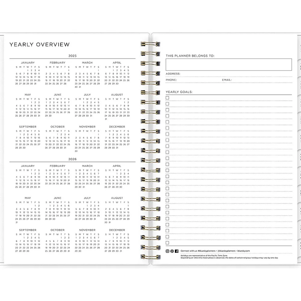 - Yearly overview, list of major holidays, and pages for your contacts, goals, important dates, and notes