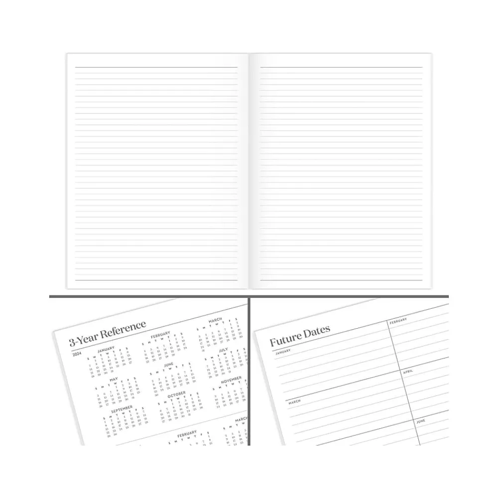 - Special pages include a 3-year reference calendar, goals, 18 note-taking pages, future dates, and a holiday list