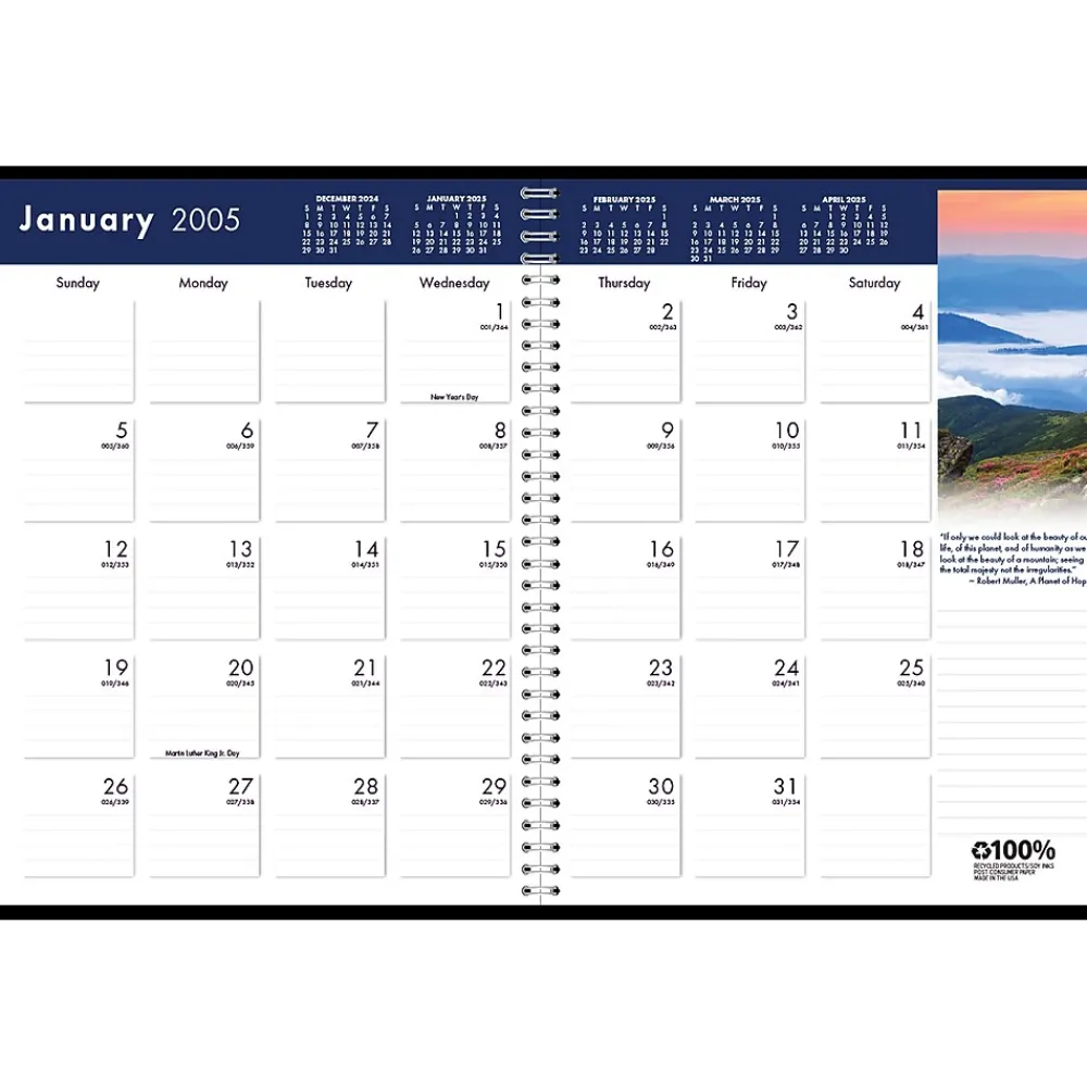 The House of Doolittle Earthscapes recycled monthly planner features a full-color nature scene with a quote to inspire on each monthly layout. The planner is wirebound with a black embossed leatherette cover to withstand the daily use throughout the year. Lightly ruled daily blocks keep notations neat. Includes a three-year reference calendar page and a three-year holiday page. Go green with House of Doolittle products, all of which are printed with soy-based inks on 100% postconsumer recycled paper. The wire binding is 90% recycled. All of House of Doolittle’s products are manufactured in the USA and FSC certified.
