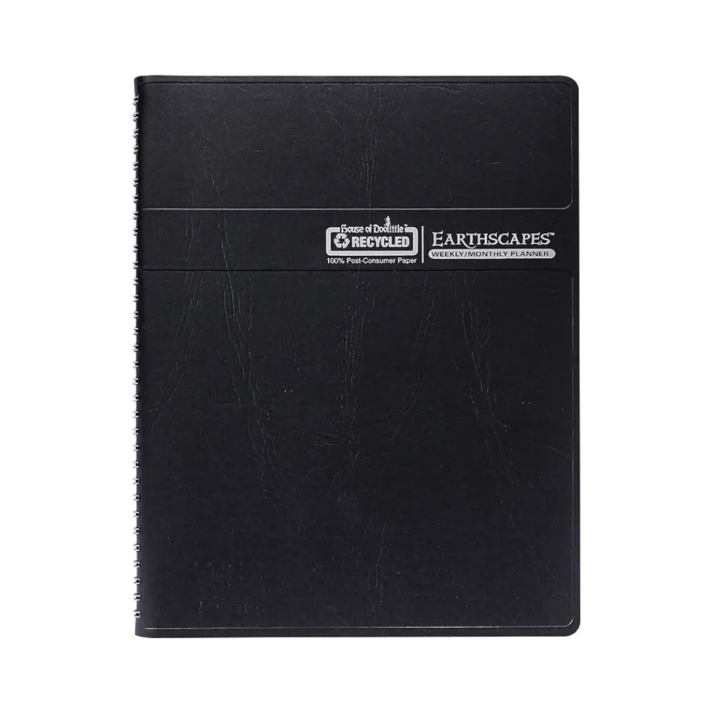 The House of Doolittle Earthscapes weekly and monthly planner offers 12 months of uninterrupted easy planning, from January 2025 through December 2025. Both monthly and weekly two-page spreads feature a full-color nature photo and a notes section to keep you organized and motivated. Plus, they include Julian dates and days remaining. Each monthly two-page spread features a tab for easy reference and also allows you to see important dates and reminders. The weekly spreads feature hourly appointments from 8:00 a.m. until 6:00 p.m. The planner is spiral-bound with 90% recycled wire and features a one-piece black embossed leatherette cover to withstand the daily use throughout the year. Printed with soy-based inks on 100% postconsumer recycled paper. Made in the USA and is FSC certified.