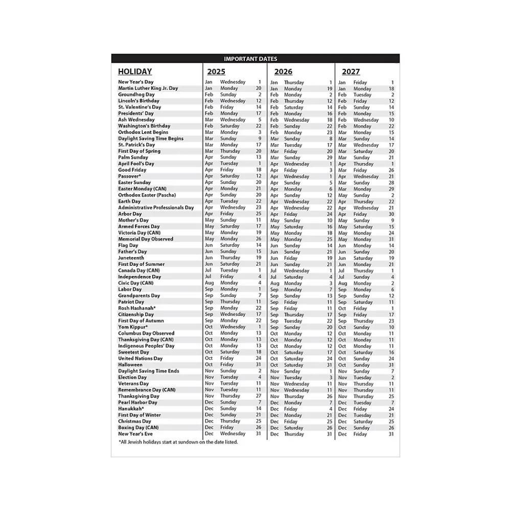 - Additional page with important holiday dates for three years in list form