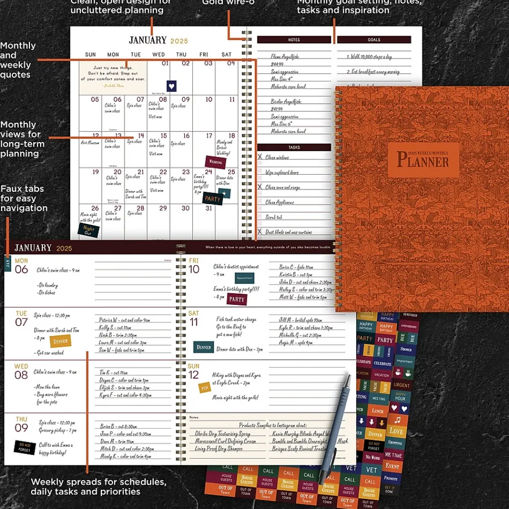 - Inside pages are designed with faux monthly tabs for easy access to weekly planning