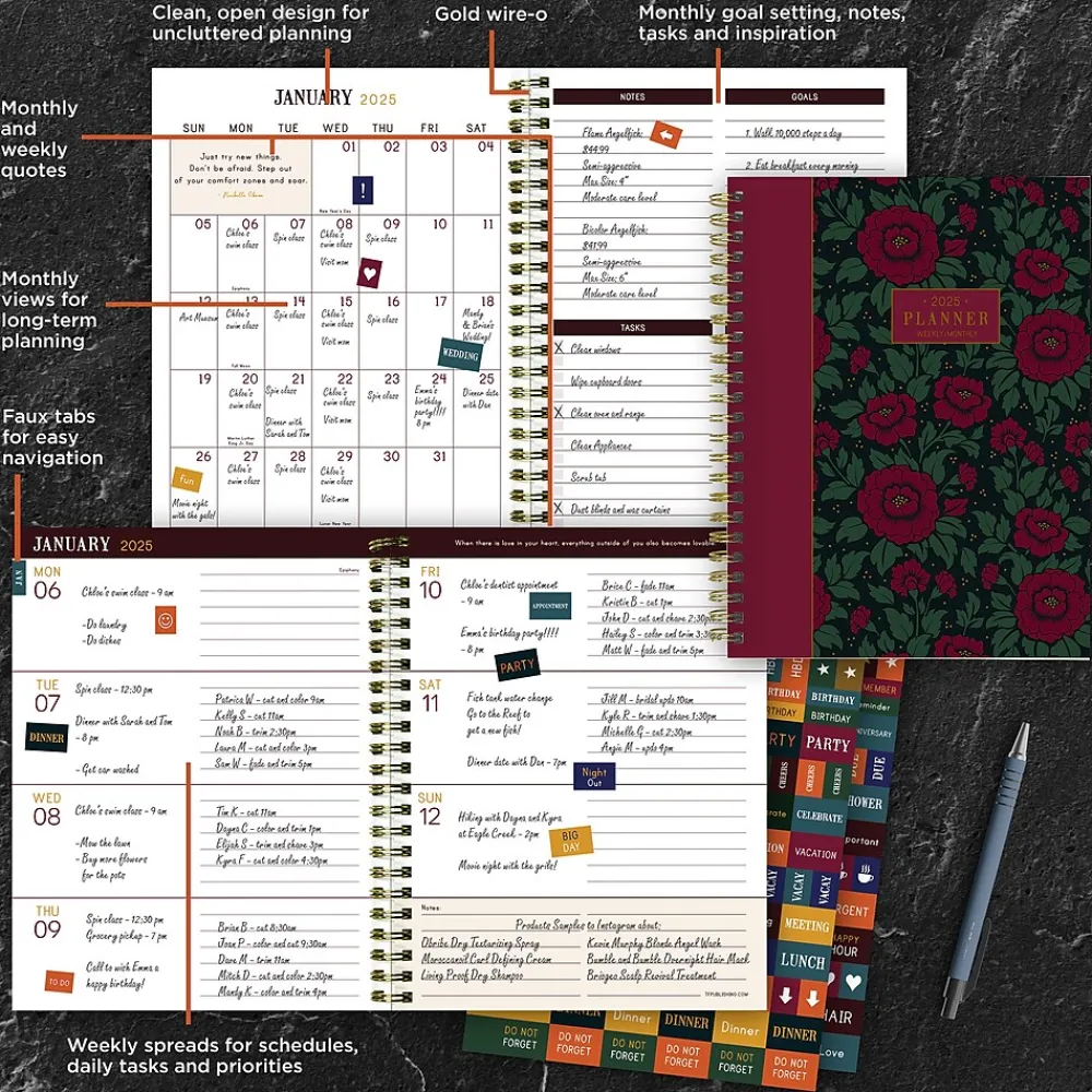- Includes 216 color coordinating stickers for a fun way to personalize your planner