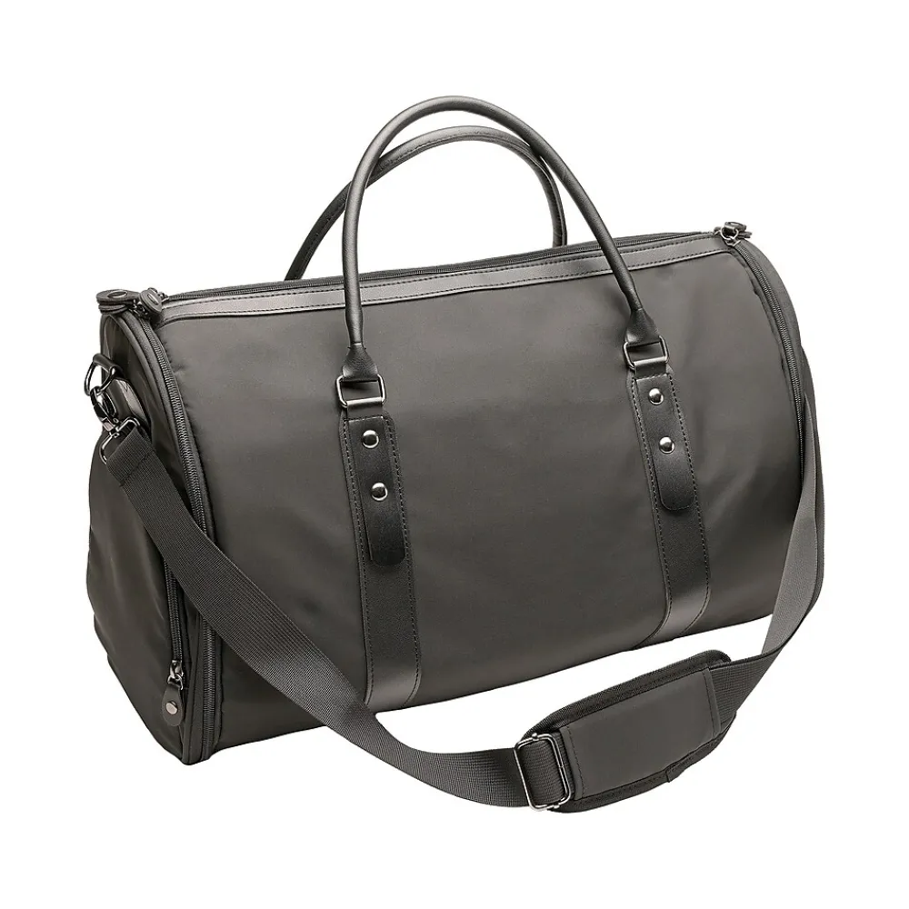 - Our 2-in-1 convertible carry-on garment and travel duffel bag is made of durable polyester and comes in black with black insides