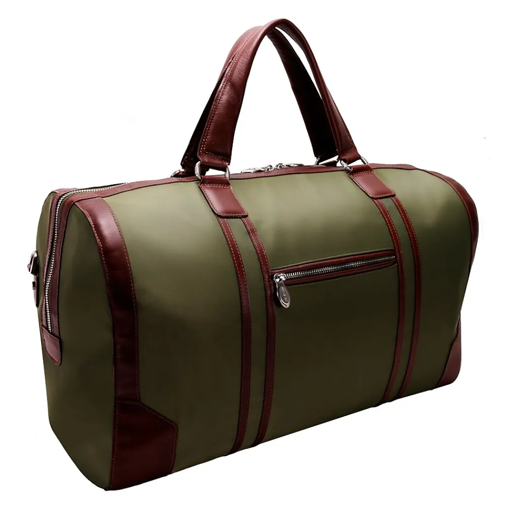 Spacious Nylon duffel with leather accents fully-lined interior with leather accents. Interior tablet pocket with organizer for business cards, pens, and accessories. Interior secure zipper pocket with organizer for accessories. Silver accent hardware and metal zippers. External easy access back zipper pocket. Removable and adjustable nylon strap with leather shoulder pad.