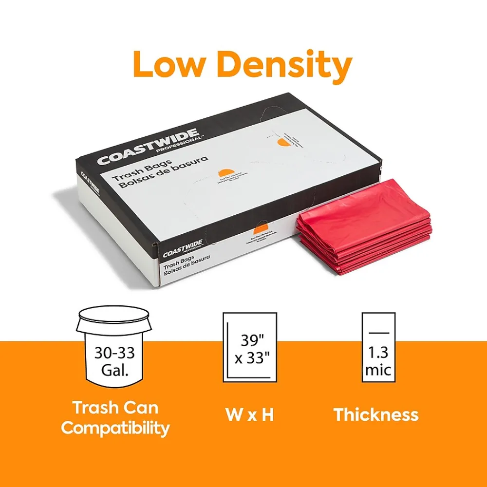 Line your garbage bins with these biohazard trash bags to reduce the risk of contamination. The red color and printed warning message promote caution during disposal, and the 30 to 33-gallon capacity fits industry-standard cans. These Coastwide Professional™ low-density 1.3-mil biohazard trash bags are compliant with federal and state regulations for tear and dart impact resistance to ensure quality and safety.