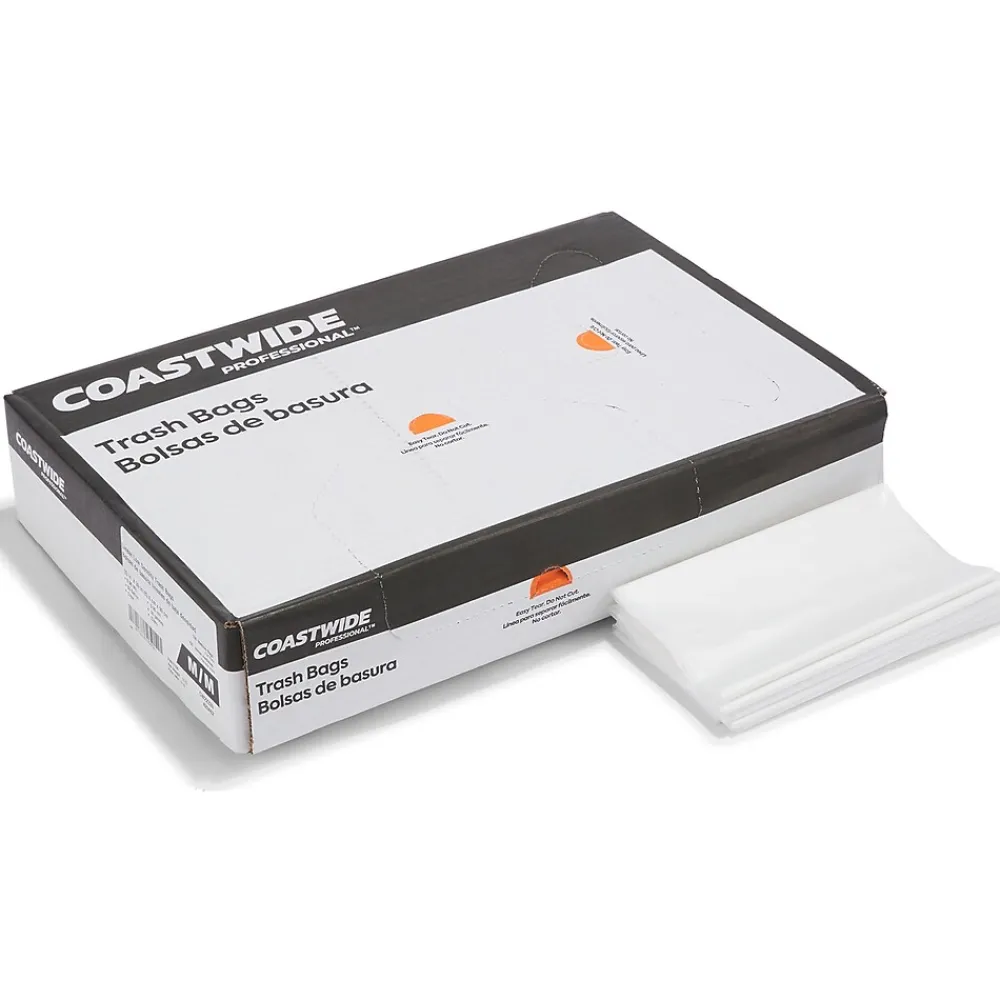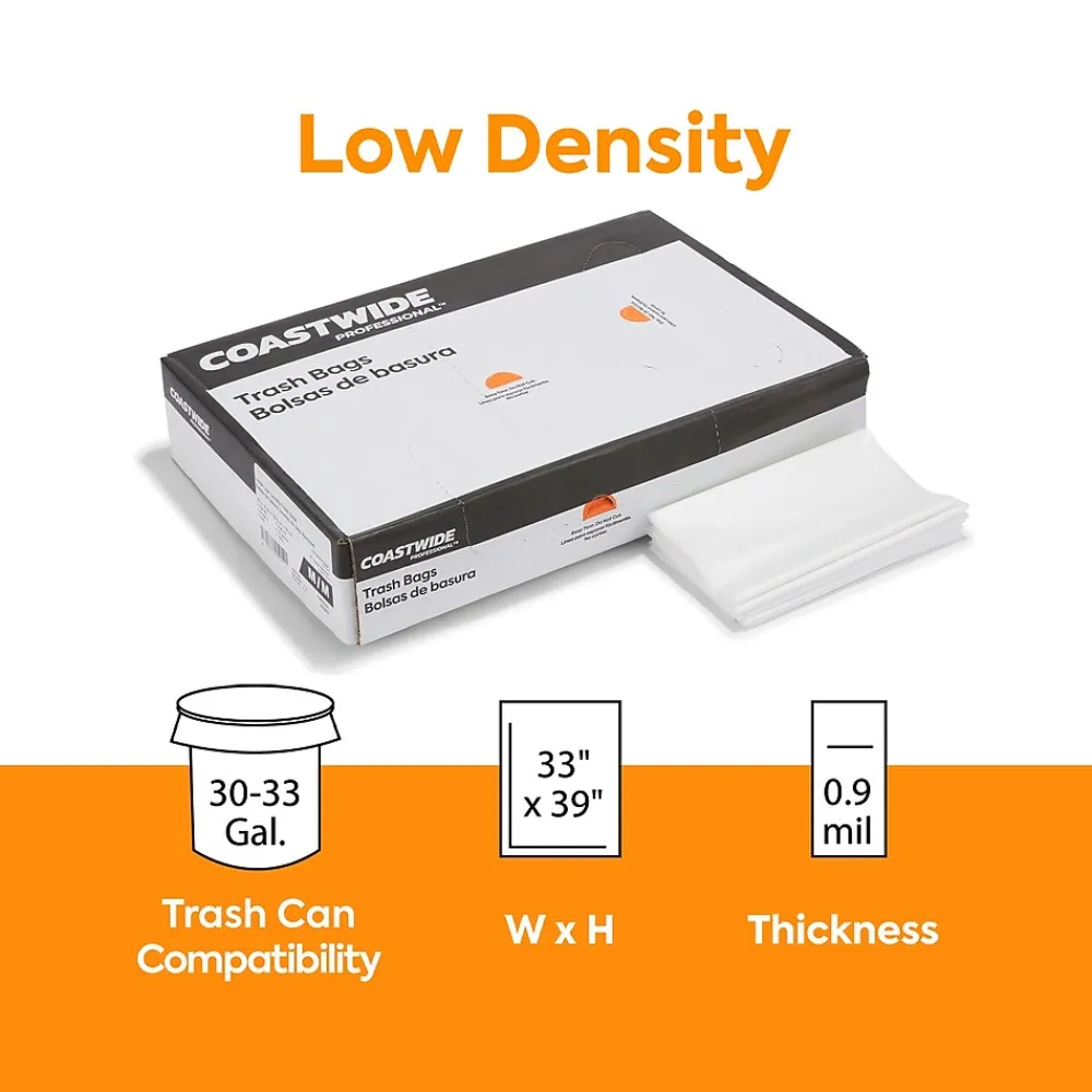 Keep your office free from clutter with these clear trash bags. The 30- to 33-gallon capacity provides ample space for waste, while the extra heavy-strength low-density plastic resists stretching and holes to avoid leaks. These Coastwide Professional™ trash bags are clear to provide a view of the contents and avoid theft and come in a carton of 150 to meet the demands of busy workplaces.