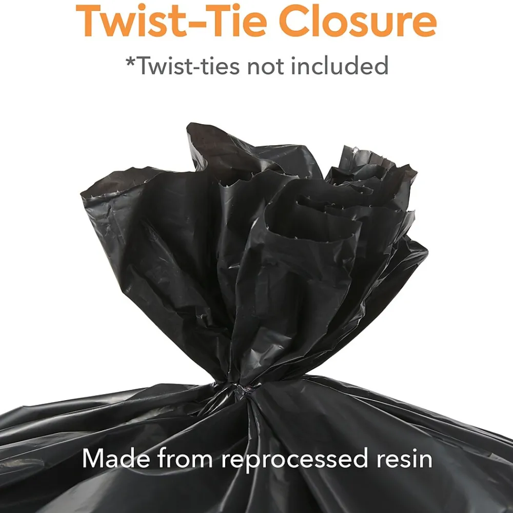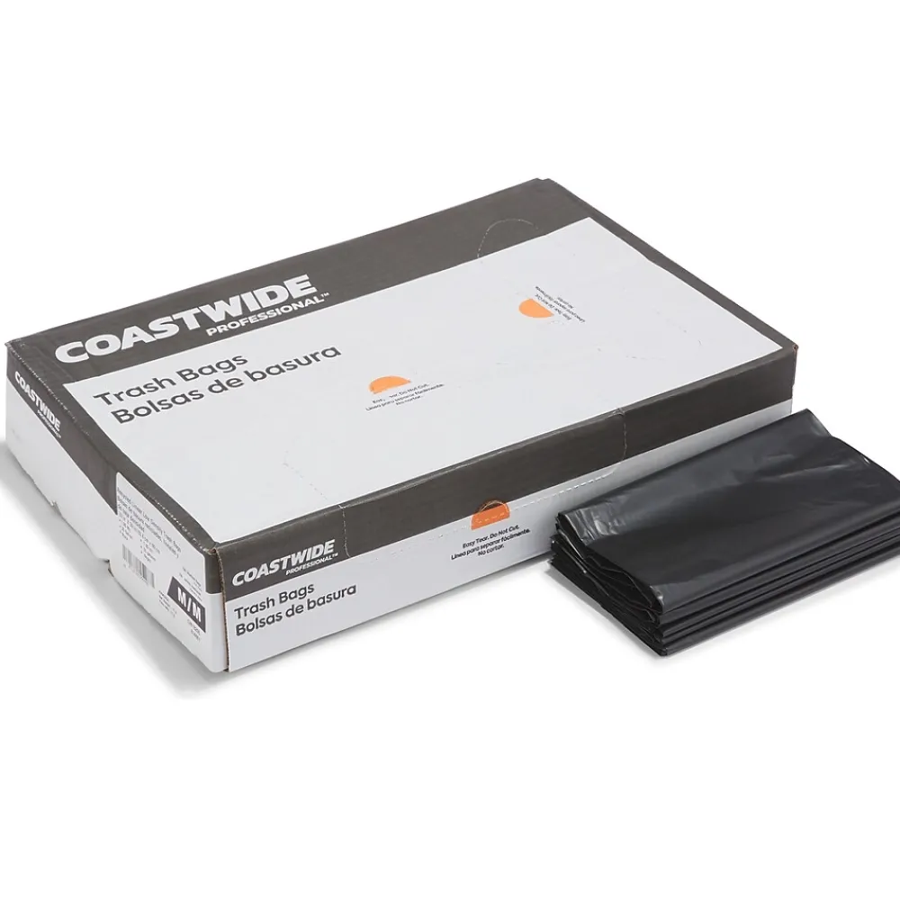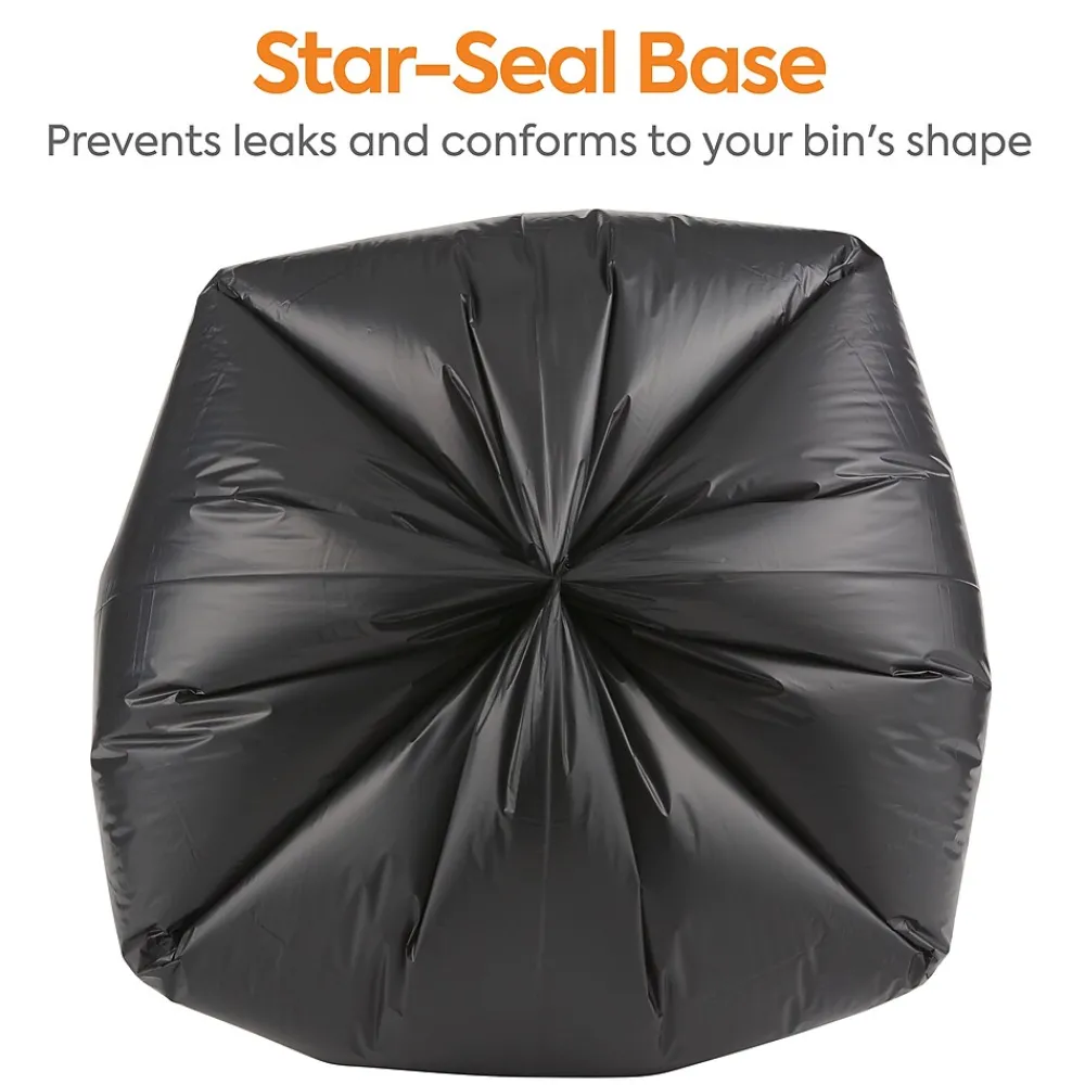 Prevent spills with these black trash bags. The star-sealed bottom distributes weight evenly and prevents leaks for safe garbage handling, while the carton of 150 provides an ample supply before restocking is needed. These 1.35-mil-thick Coastwide Professional™ trash bags hold 30 to 33 gallons of waste, which is suitable for office kitchens, breakrooms and other public spaces, and are made of reprocessed resin to resist ripping and enhance durability.
