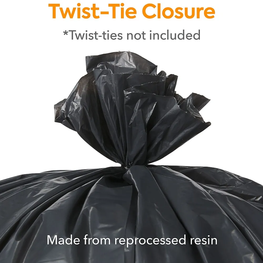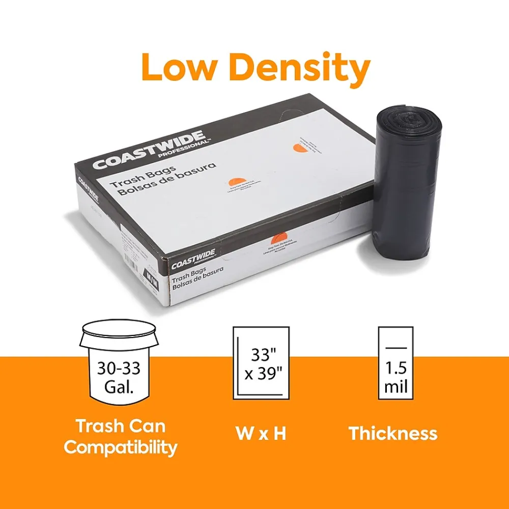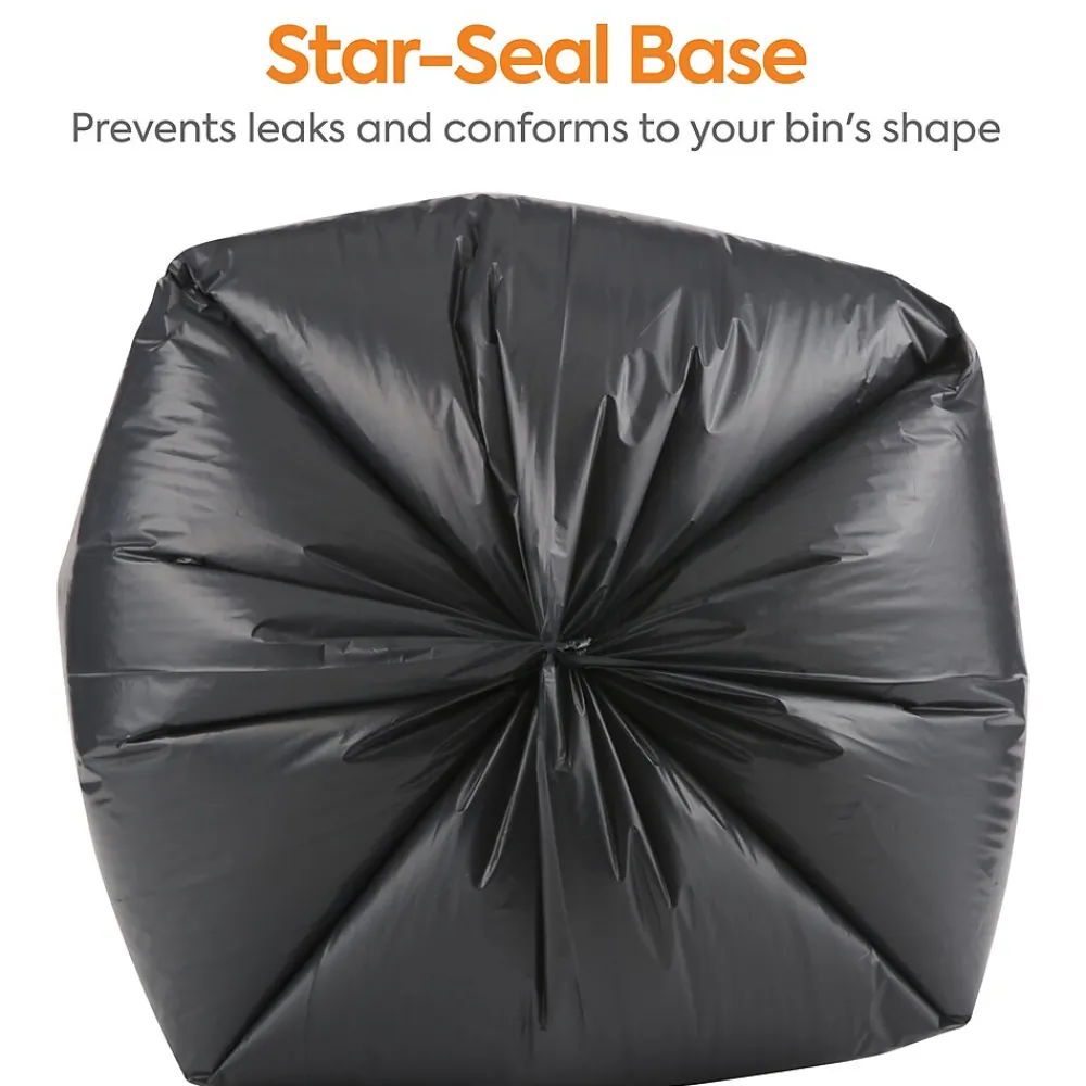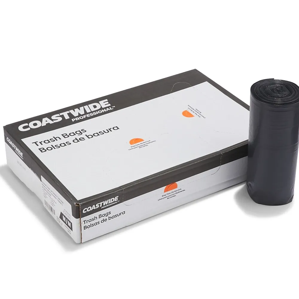 Keep your cleaning supply closet stocked with this 100-count carton of black trash bags. The dark color keeps contents discreetly hidden from sight, while the star-sealed bottom on each bag provides added protection against leaks. These Coastwide Professional™ black trash bags are crafted from low-density resin for enhanced puncture resistance, making them perfect for removing sharp objects from industrial sites.