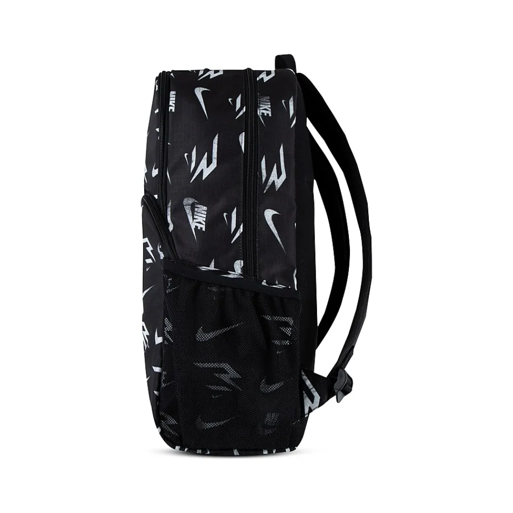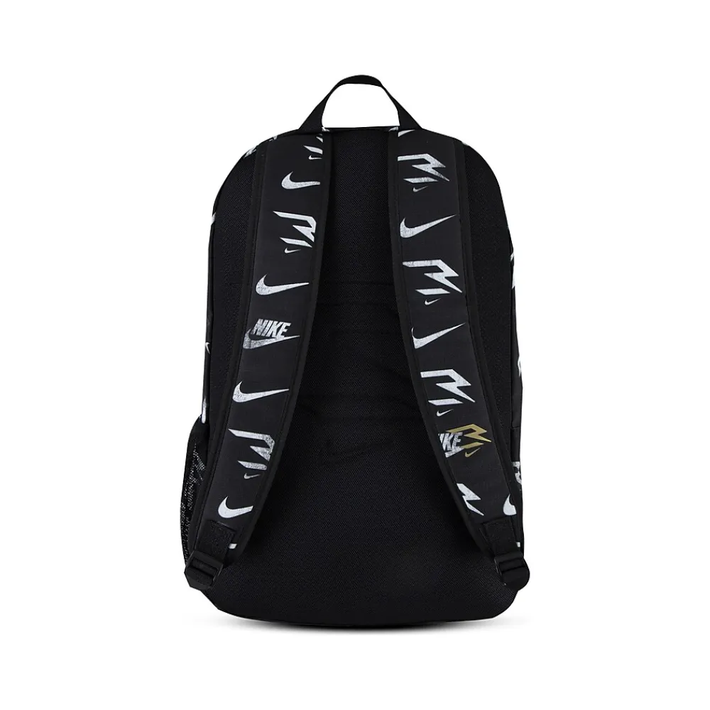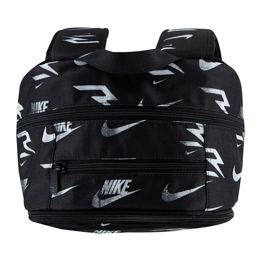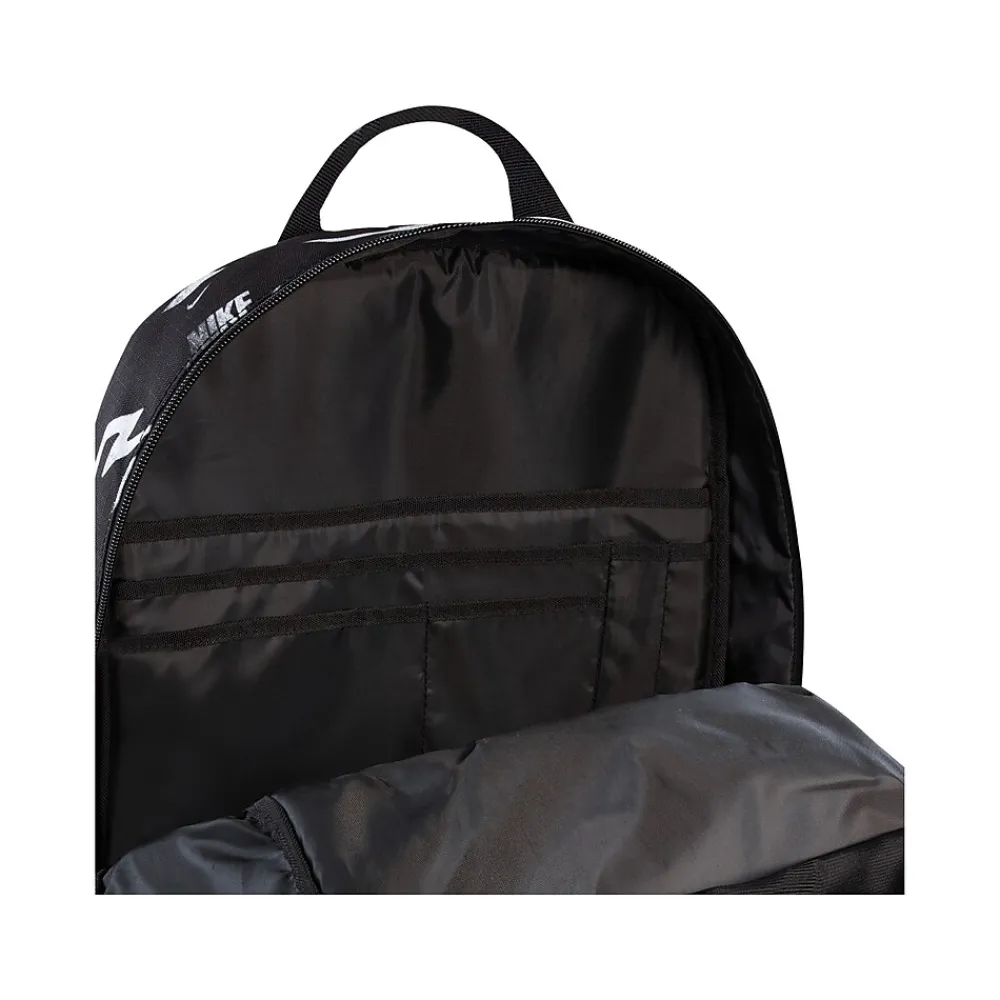 - Laptop backpack makes travel with electronics simple; made of durable polyester fabric and comes in black with an allover Nike logo pattern in white