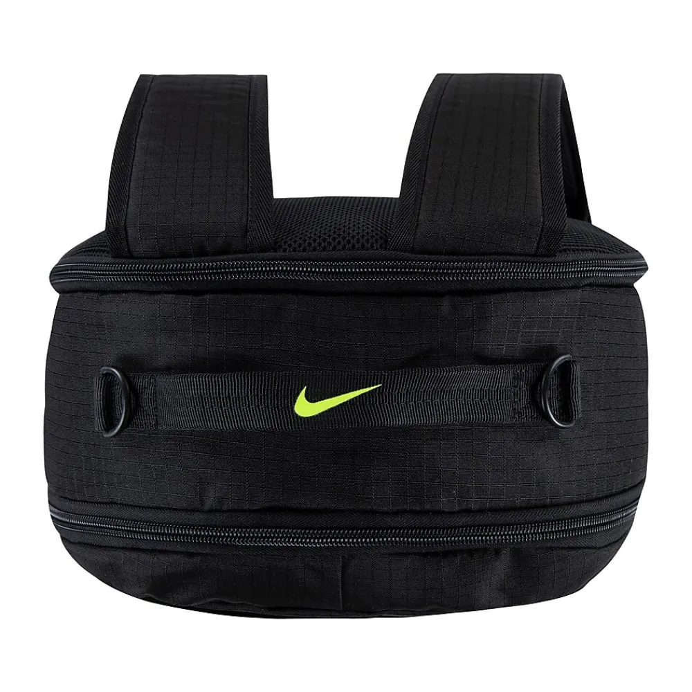 - Laptop backpack makes travel with electronics simple; made of durable polyester fabric and comes in black with a Nike logo in green