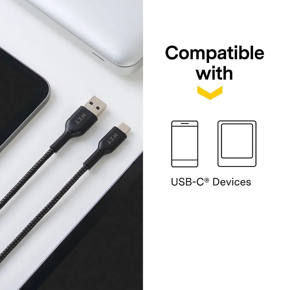 Utilize an adapter or laptop for reliable charging with this USB-C to USB-A cable. A braided cable resists tangling and damage, while the strain-relief design of this NXT Technologies™ USB-C to USB-A cable easily withstands up to 2,000 bend cycles.