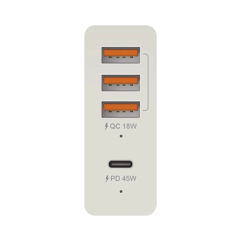 - 45W USB-C output: 5V/3A, 9V/3A, 12V/3A, 15V/3A, and 20V/2.25A; 18W three-port USB-A output: 5V/3.6A (each 2.4A max), Quick Charge is available when using one port — 3.6-6.5V/3A, 6.5-9V/2A, and 9-12V/1.5A