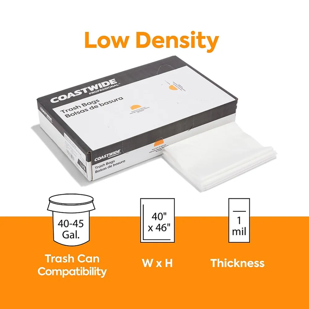Handle your industrial waste safely with these durable trash bags. The sturdy star-sealed bottom distributes weight evenly to reduce the risk of tears and leakage, while the clear material provides a view of the objects for added security. These 40 to 45-gallon Coastwide Professional™ trash bags are 1-mil thick to resist puncturing or ripping by sharp items, ensuring safe and reliable waste disposal.