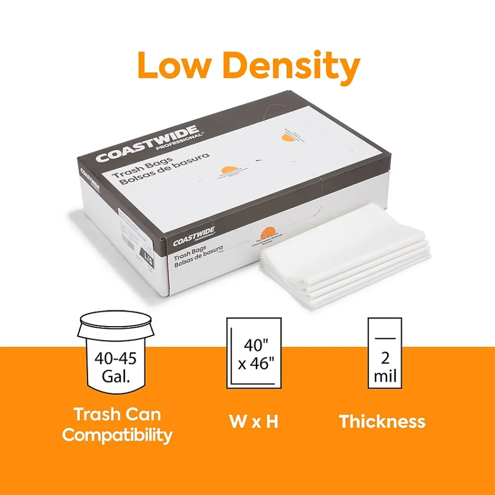 Reduce the risk of messes and spills around your workplace with these clear trash bags. The star-sealed bottom distributes weight evenly to optimize carrying capacity, while the low-density polyethylene prevents holes from stretching to avoid leaks. These 40 to 45-gallon Coastwide Professional™ low-density trash bags are 2-mil thick to resist tearing or puncturing by sharp objects, ensuring safe waste disposal, and are packaged in a carton of 100 for an ample supply.